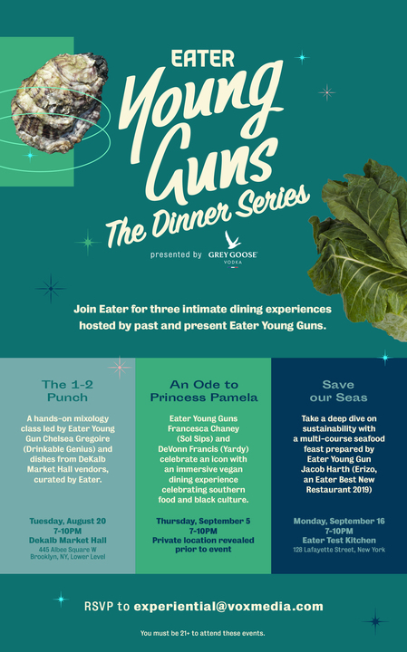 The Eater Young Guns program is one of the brands most beloved tentpoles, an annual list celebrating the industry’s fresh new faces. From sommeliers to chefs, cheesemongers to captains, these are the talents shaping the future of dining in America. In 2019, our partnership with Grey Goose brought the celebration to life with our first annual Eater Young Guns Summit, as well as a trio of intimate pop up events which took place across New York City this August and September.