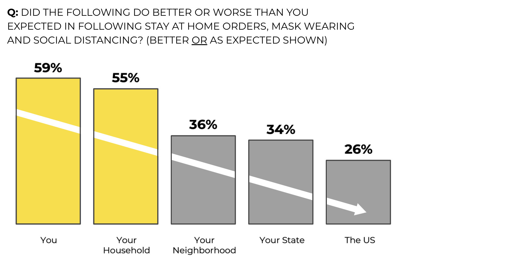 With trust eroding, so goes our expectations and faith in larger society to do the right thing.  As a result, we start placing the bulk of our trust only in ourselves and our families.