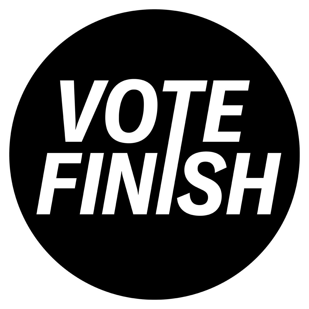 Christine Sun Kim: In American Sign Language (ASL), we sign “finish” as a way to conjugate the past tense. When you sign “eat finish,” that means “ate” in English, “write finish” means “wrote,” and so on. For the sticker design, I used “vote finish” as my version of the English “I voted” stickers. By connecting the words together, the sticker also visually resembles how you would sign “vote” in ASL.