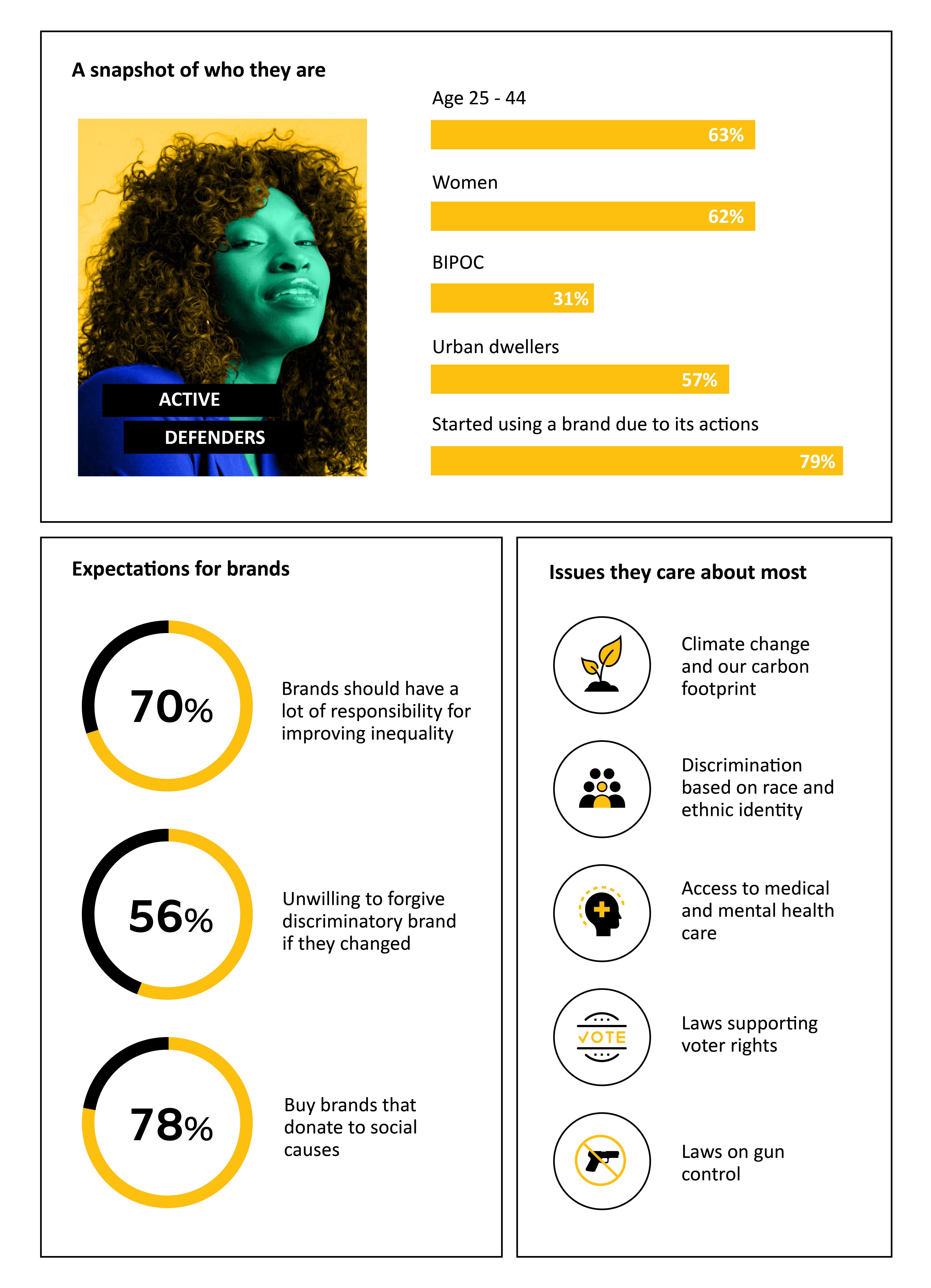 Active Defenders are vocal about social causes and have a high incidence of contacting government officials and advocating via social media. While they believe the government has the greatest responsibility for addressing inequities in society, these citizens also say individuals, non-profit organizations, the media, and brands have equally high responsibility for motivating change. As such, Active Defenders push all elements of society to change and not just the government.