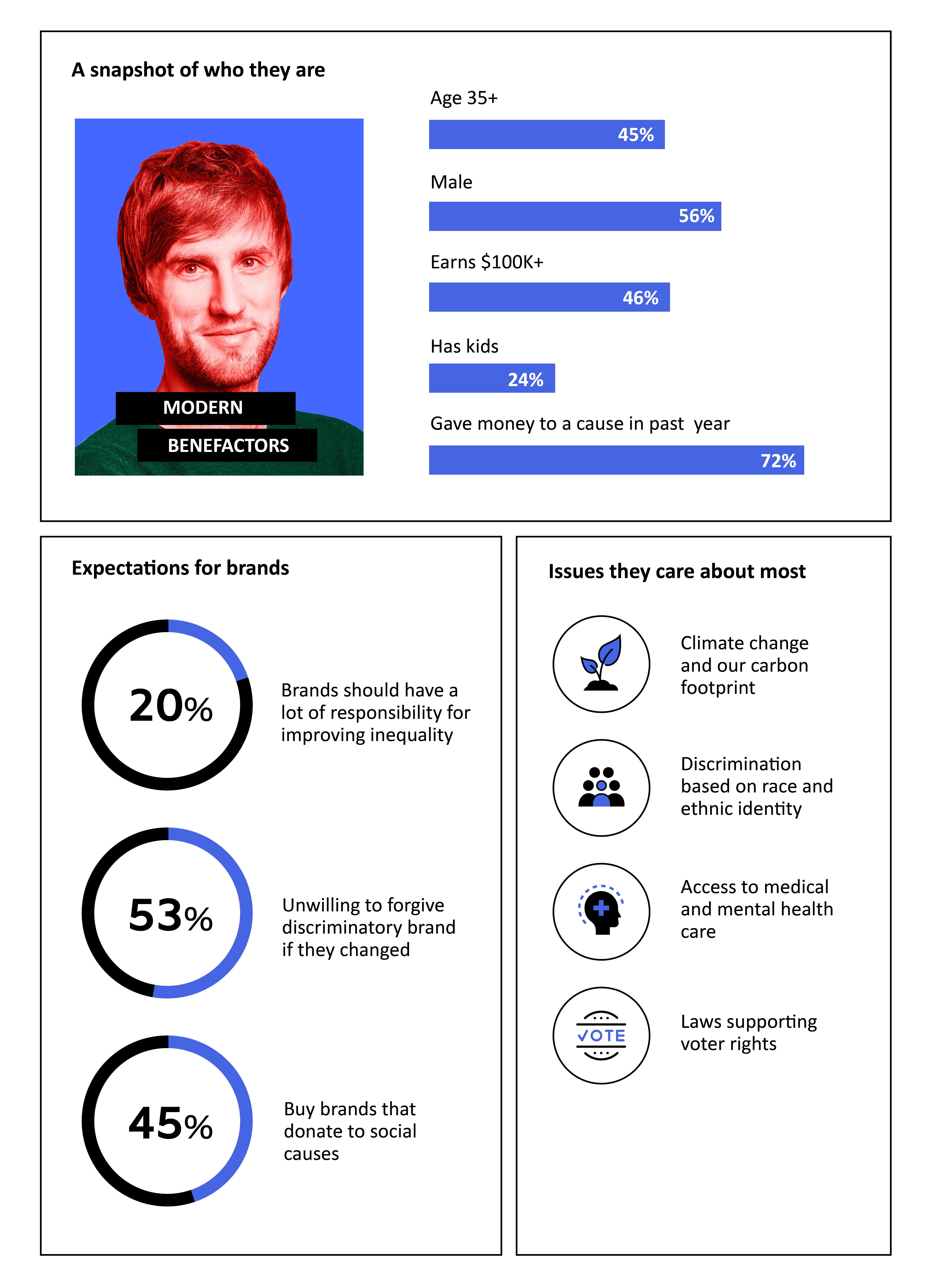 Modern Benefactors are more forgiving of brands that don’t align with their values, compared to the other groups, and fewer have stopped using a brand due to its actions. While they believe brands have the power to improve society and expect them to take positions, their reaction to errant brands is less severe.