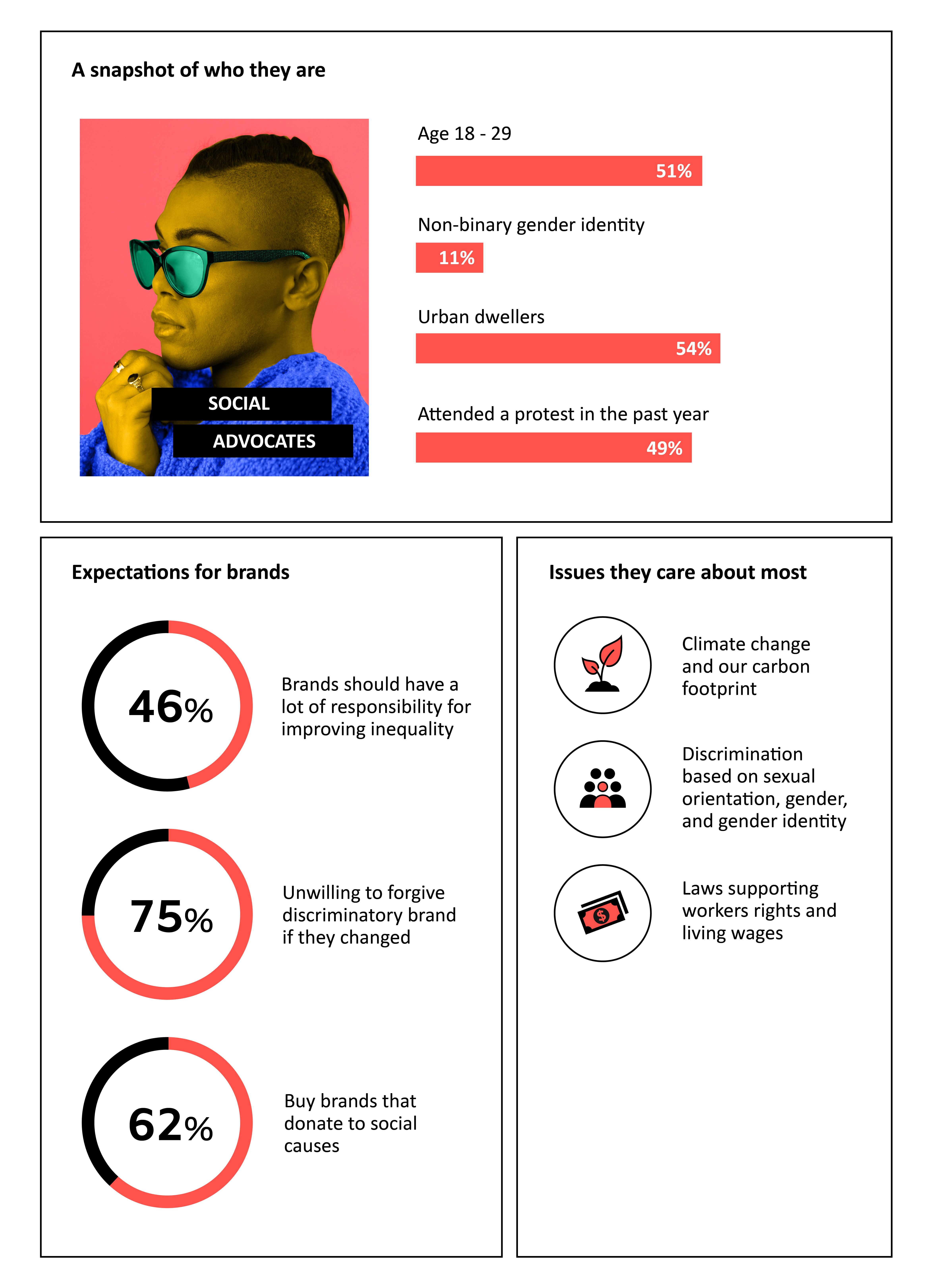 When looking to reach Social Advocates brands should show genuine support for a cause or individuals—particularly those impacted by discrimination that’s based on personal characteristics. This group has high expectations for brands and wants to see big ideas for helping people at the individual level.