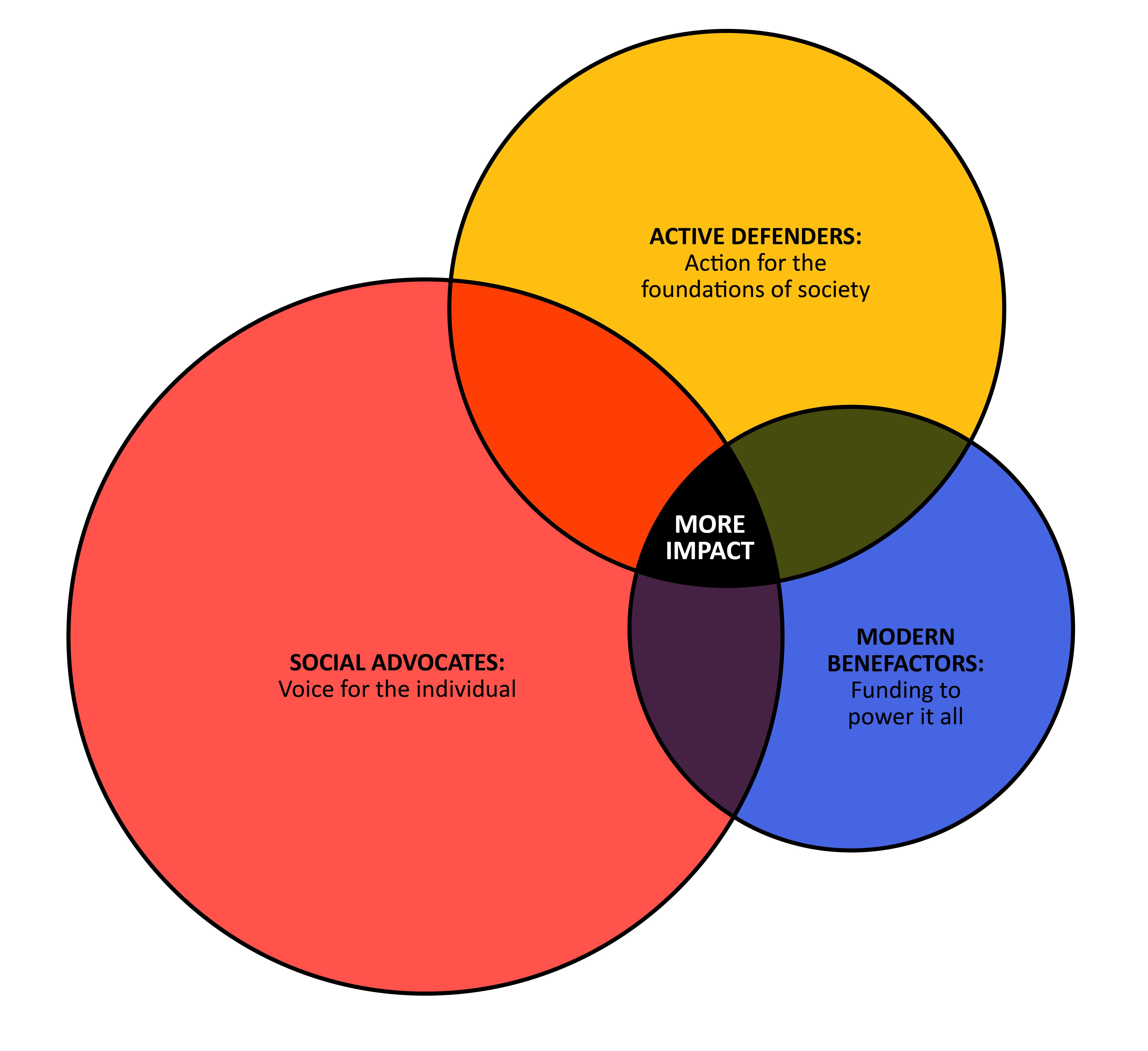 We’ve found the majority of our audience falls into three groups of advocacy personalities: Social Advocates, Active Defenders and Modern Benefactors.