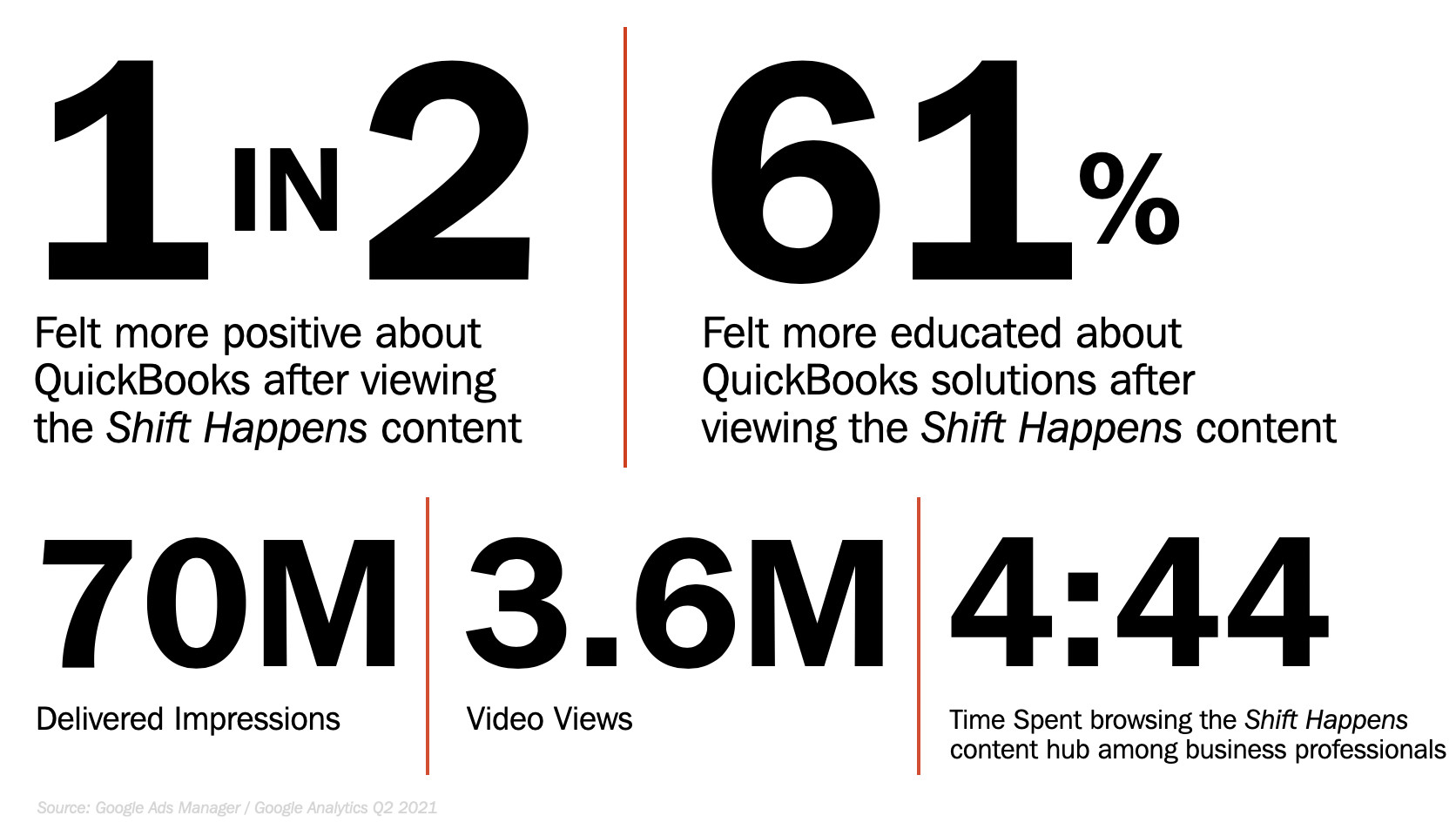 “We are proud of the work we did to raise the profile of so many important small business owners who were forced to make pivots as a result of the pandemic. We couldn’t be more thrilled with the results and the opportunity to bring the QuickBooks story to life across platforms like audio, video and more.” – Dave Raggio, Director of Acquisition Marketing at Intuit QuickBooks