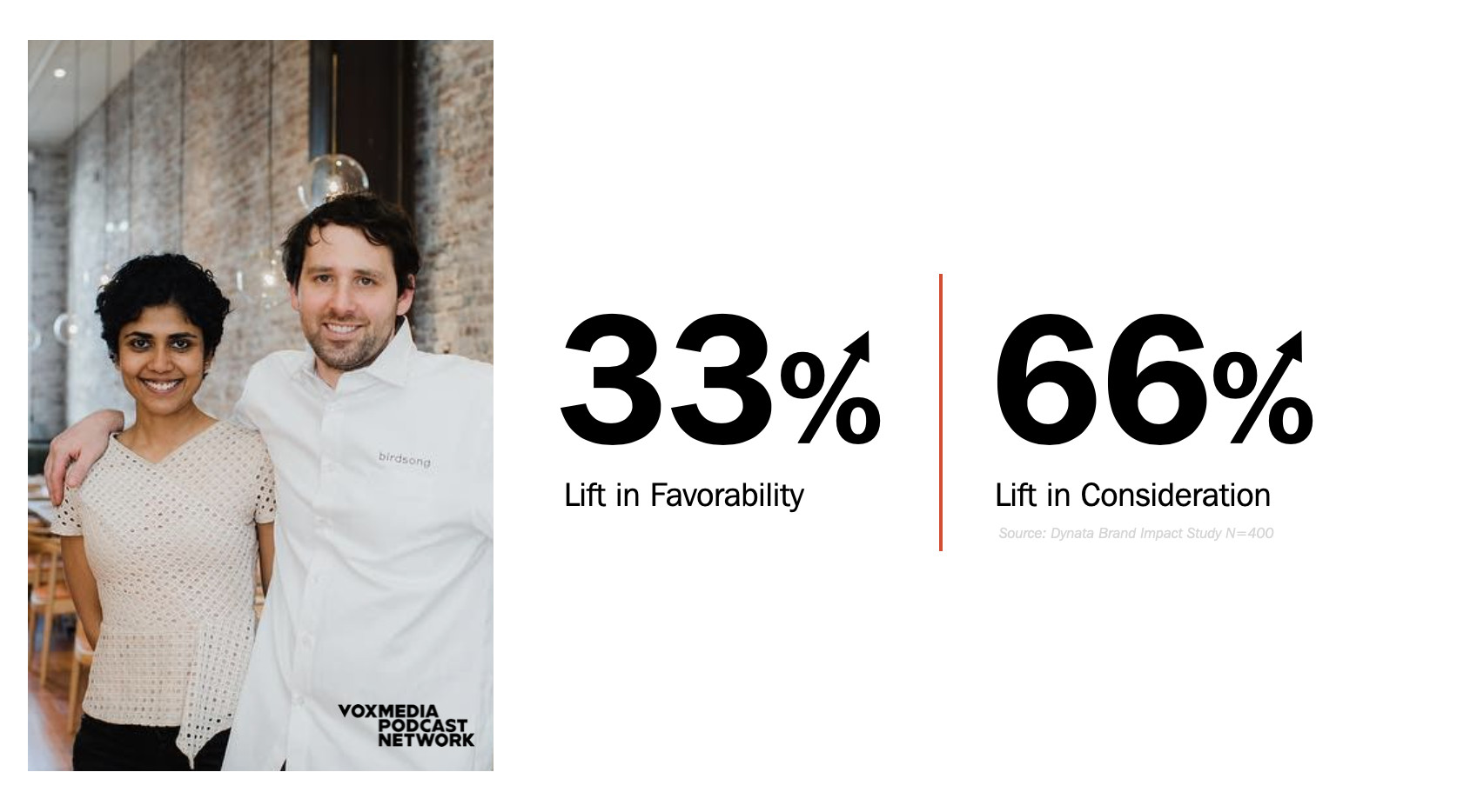 In partnering with Vox Media, QuickBooks was able to tell these stories at scale, across a number of topically diverse networks, the Vox Media Podcast Network, and Concert which were able to move the needle for brand favorability, especially among QuickBooks’ target audience of business decision makers.