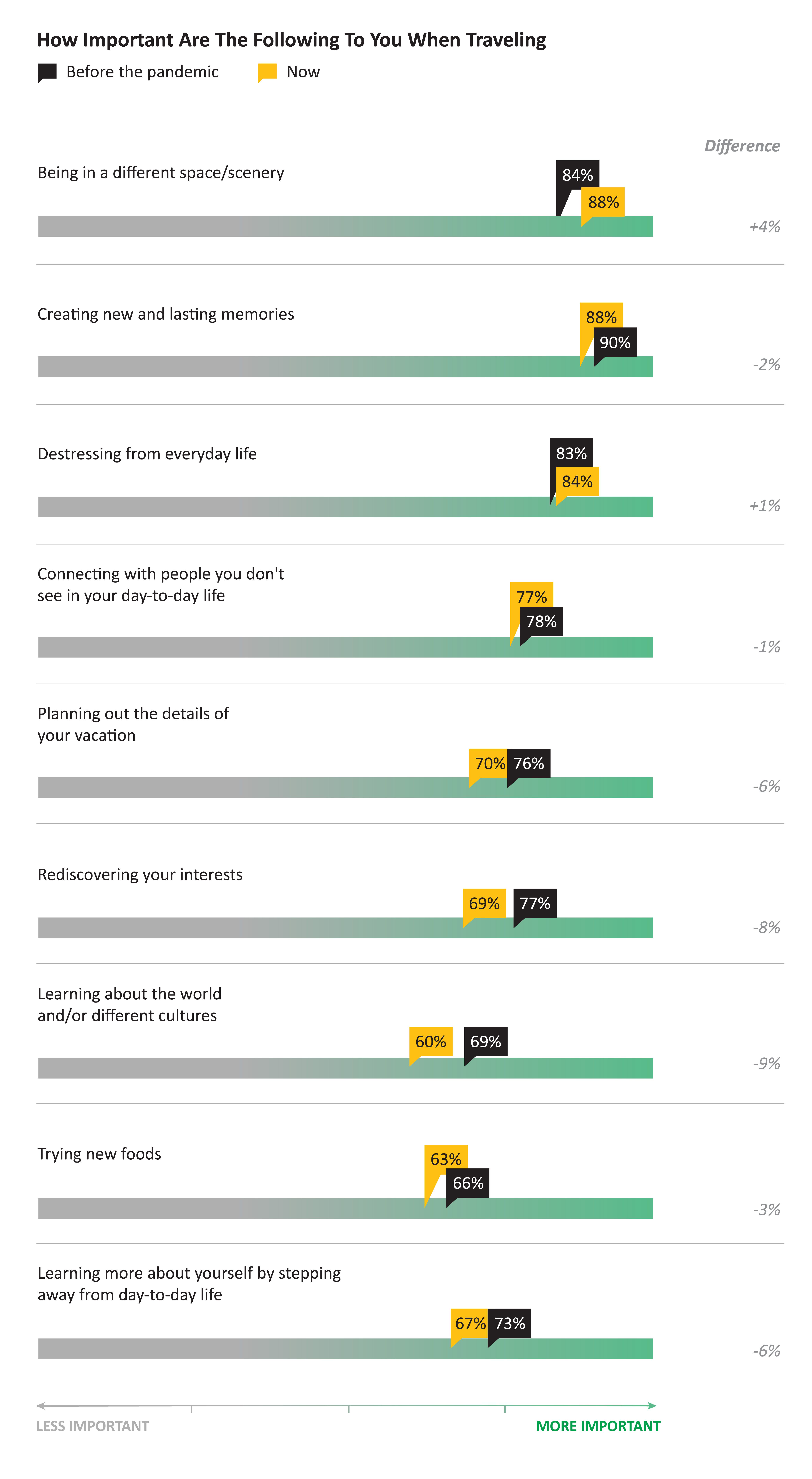 Reasons to travel primarily remain the same with the need for different scenery, de-stressing, and making new memories indexing the highest.