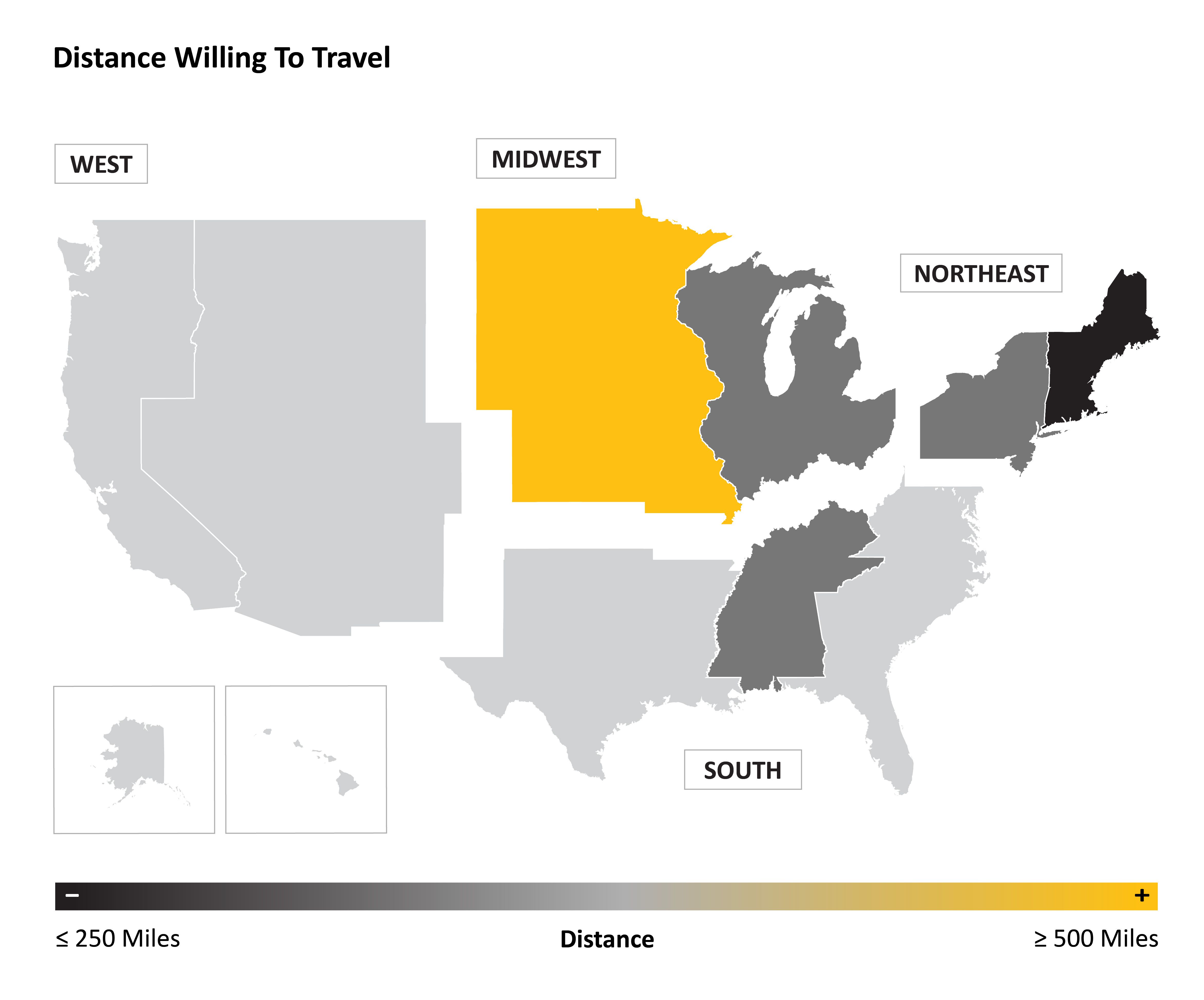 Many have been forced to keep vacations close to home, but where you live matters. New Englanders are more likely to stay within a 250 mile radius, whereas those in states like North Dakota, South Dakota and Kansas are willing to drive 500 or more miles. There is less variance regionally, but again, those in the western midwest or west coast are more apt to drive longer distances.