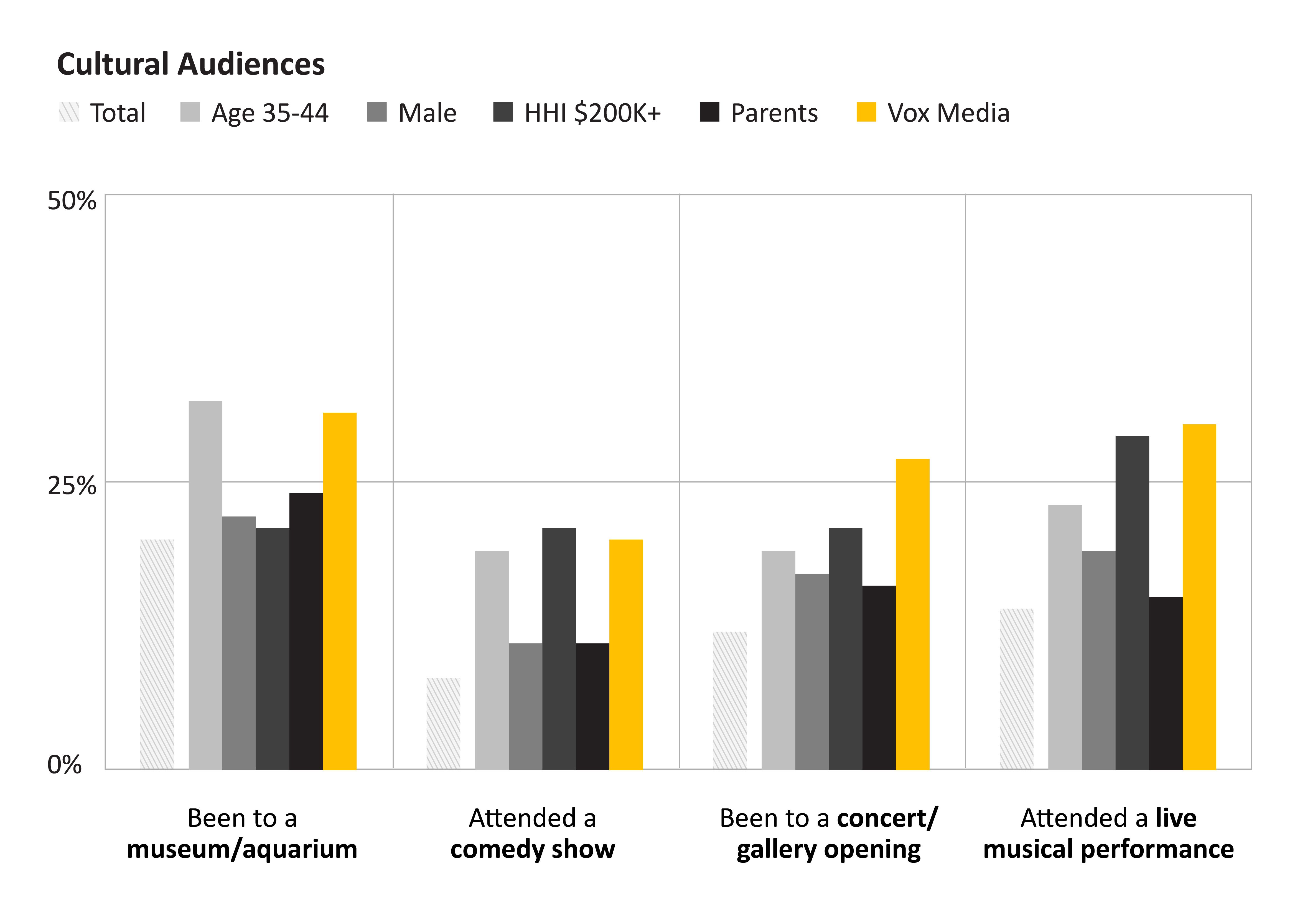 - 5.4x more likely to go to a concert/gallery opening compared to Non-Vox Media travelers