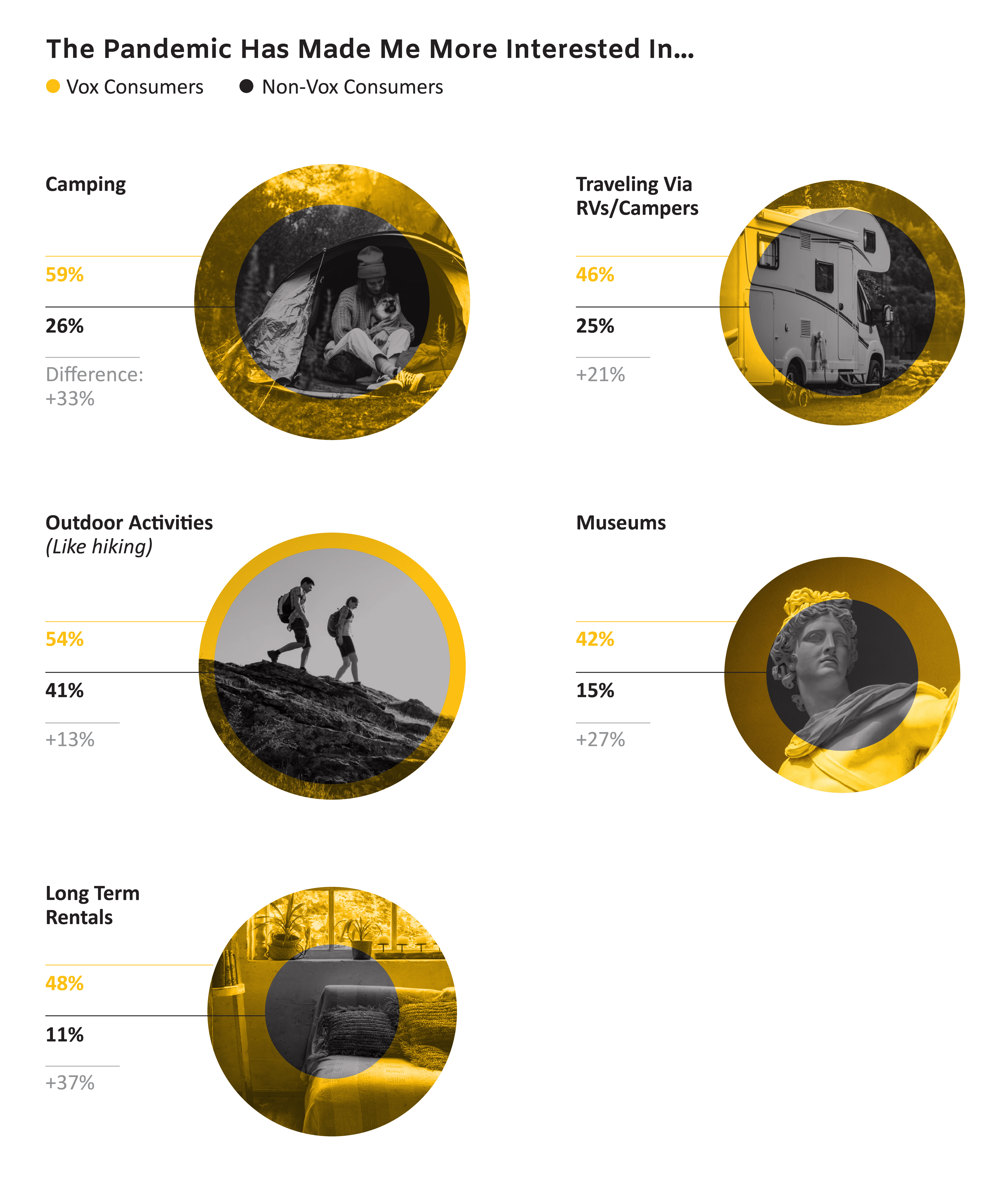 These positive differences between Vox Media Travelers and Non-Vox Media show how valuable this audience is across the travel and tourism industries. In general, our audiences are also showing increased interest in different ways to travel, such as long term rentals or camping: