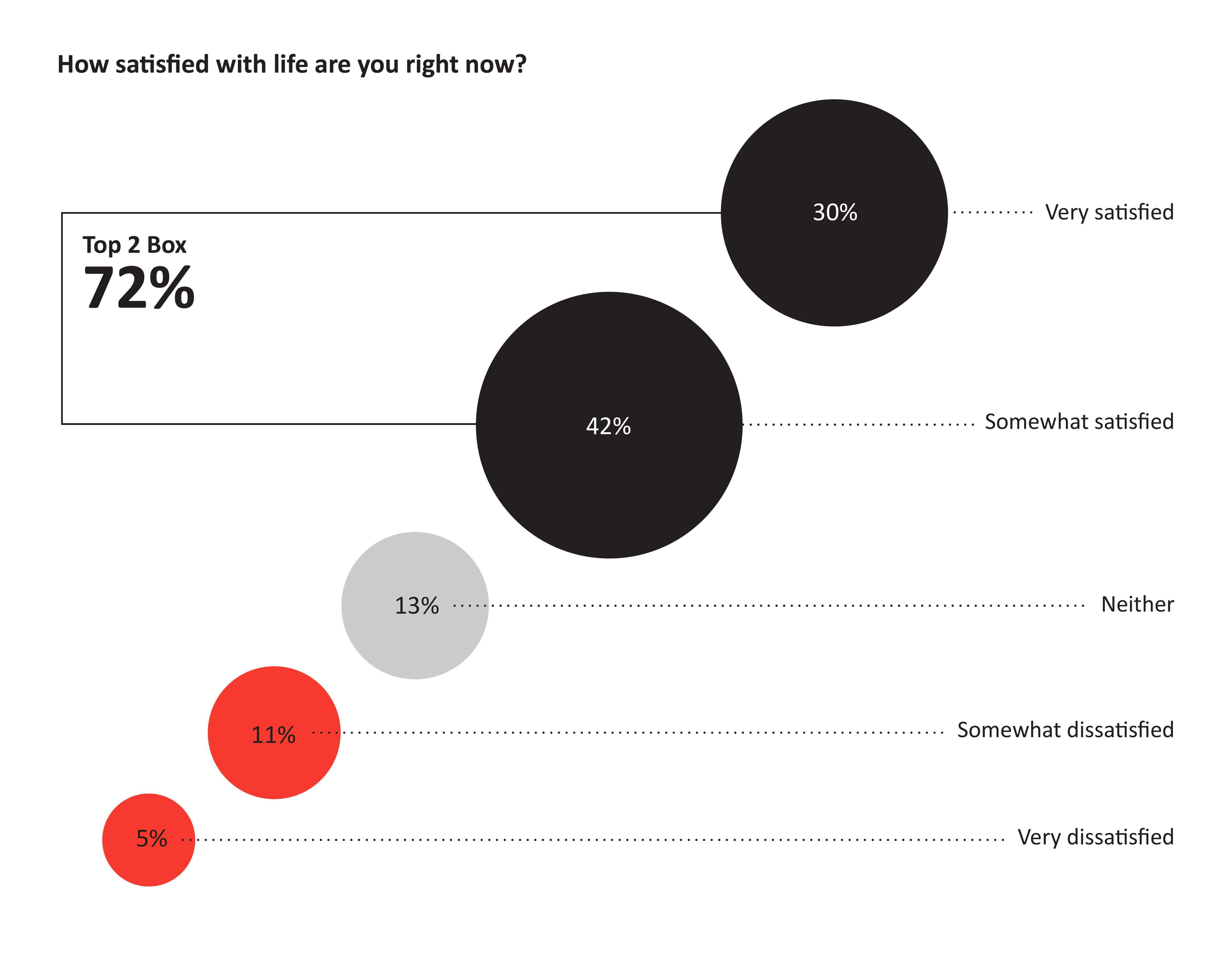 Regardless of the upheaval in their lives, we did see significant resilience across demographics, with 72% of people citing they are generally satisfied with life overall.