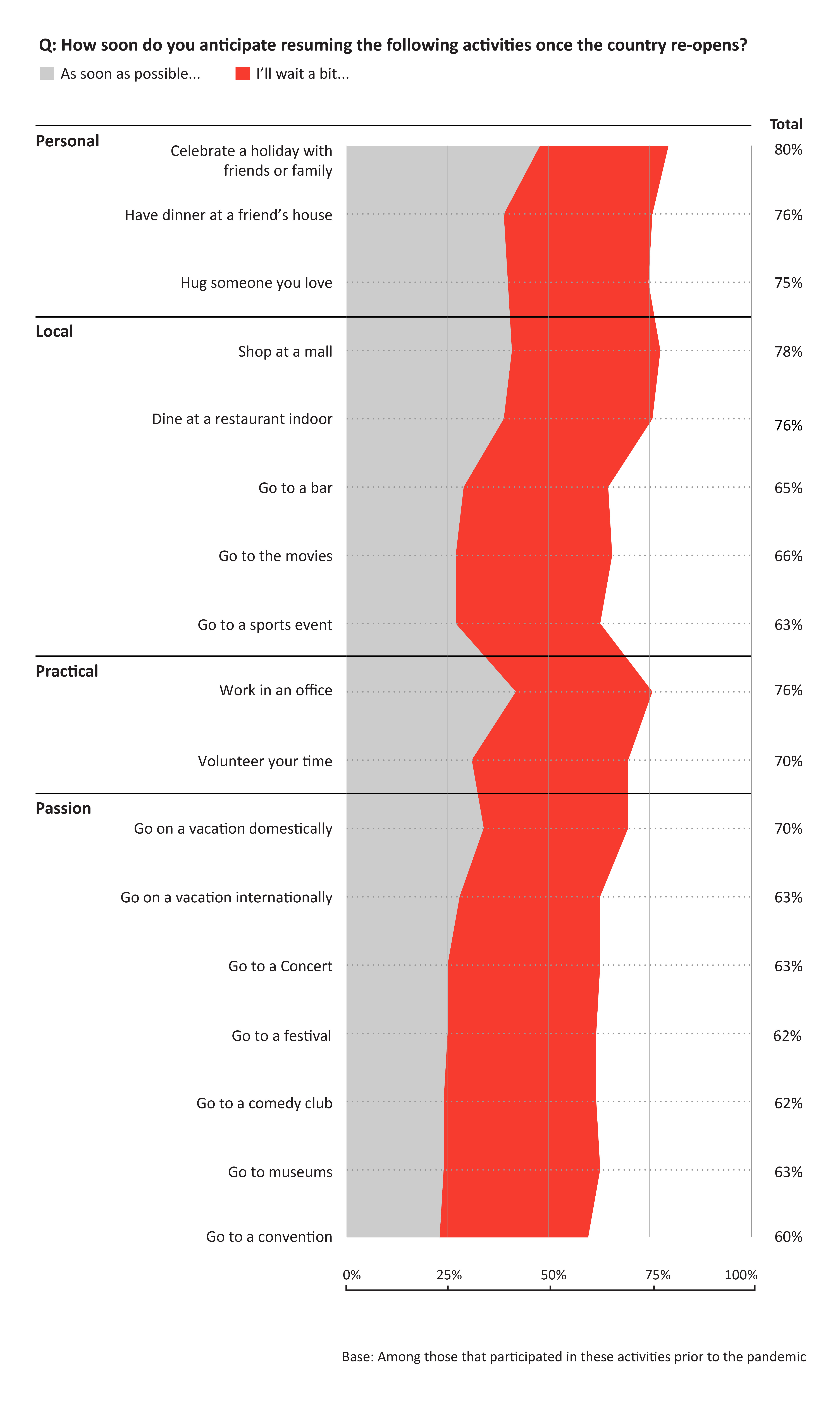 The majority of consumers (~60%+) are open to re-engaging with the things they used to do before the pandemic,even if it means waiting just a little bit. As shown in the visualization below, most people are looking forward to celebrating a holiday with family and friends, having dinner at a friend’s, and hugging someone they love “as soon as possible.” Later on, they are looking forward to expanding their activities and spending. But there is definite interest in chasing that lost vacation, and 1 in 4 consumers are itching to go to that missed concert, sports game, or comedy club as soon as possible.