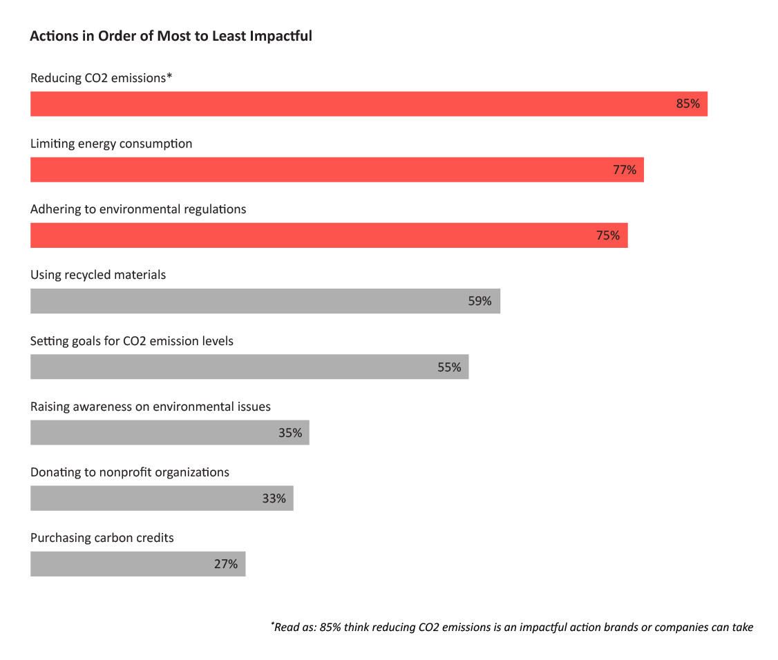 • They don’t want brands to simply support environmental sustainability, they want them to take action to be environmentally sustainable. There’s a clear hierarchy of actions brands can take to be perceived as impactful by consumers: reducing CO2 emissions, limiting energy consumption, and adhering to environmental regulations ranked highest. Brands can’t just “buy” their way out — purchasing carbon credits, donations, and raising awareness ranked lowest.