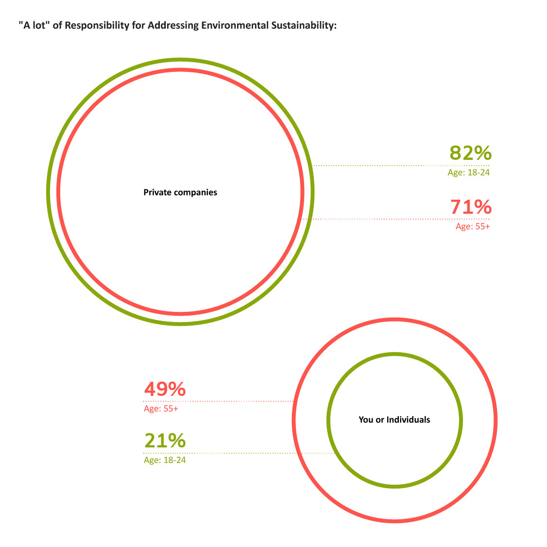 Generally speaking, as age increases the more likely they believe that individuals have a stronger responsibility to address environmental sustainability. As age decreases, the more likely they believe that private companies have a stronger responsibility.