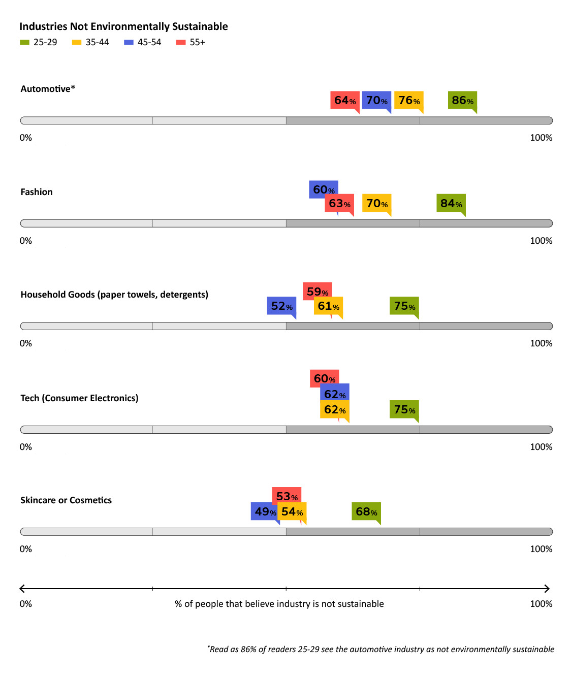 The harshest critics of industry are our younger Millennial audience (age 25-29). They see many industries as significantly less sustainable compared to our age 35+ audience.