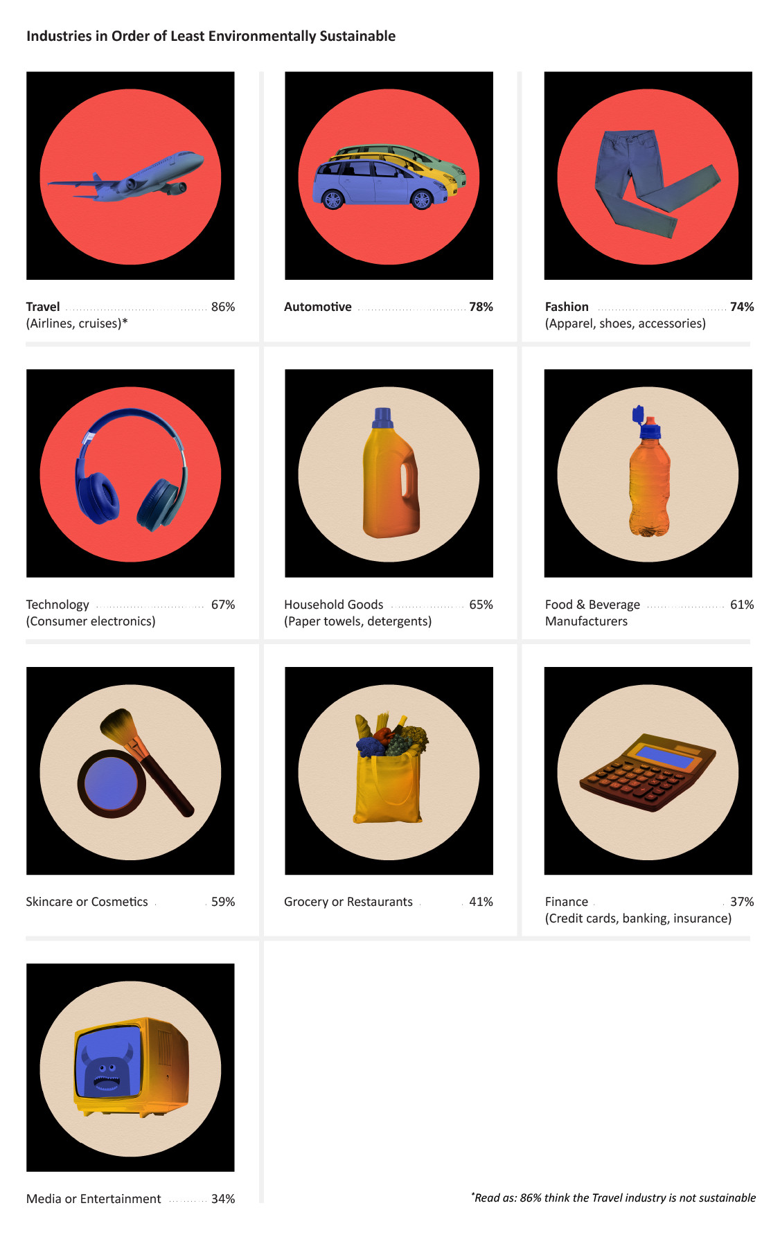 With greenhouse gases and fossil fuels at the top of the list of threats, it’s no wonder travel and automotive are defined as the industries contributing least to environmental sustainability. The fashion industry is also seen as unsustainable, likely due to strong press coverage of “fast fashion” and the havoc it wreaks on the environment.