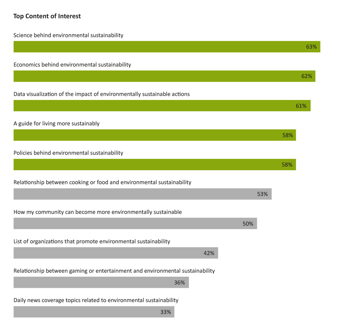 Lastly, we asked which topics would attract their attention when browsing the internet. The category-specific content topics were actually of lesser interest than the science, economics, and politics of environmental sustainability. Data visualization and guides for living are also ranked as top content formats.