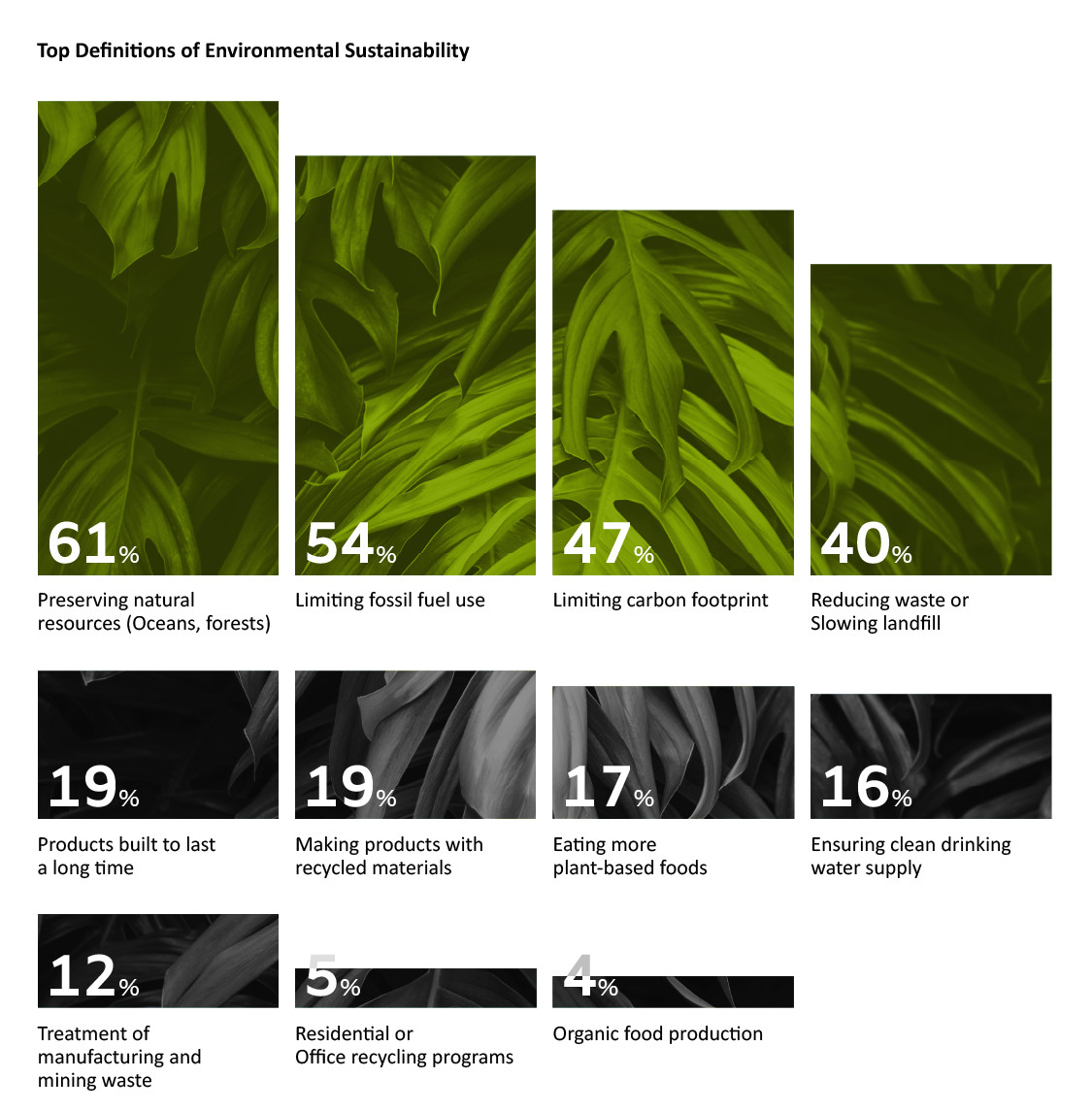 • Our audience believes that environmental sustainability is most deeply tied to taking actions that protect the environment: preserving natural resources, limiting fossil fuel use, and limiting carbon footprint. They expect brands to limit the use of environmentally harmful practices, as opposed to relying on eco-conscious alternatives such as recycling, organic food and multi-use products.