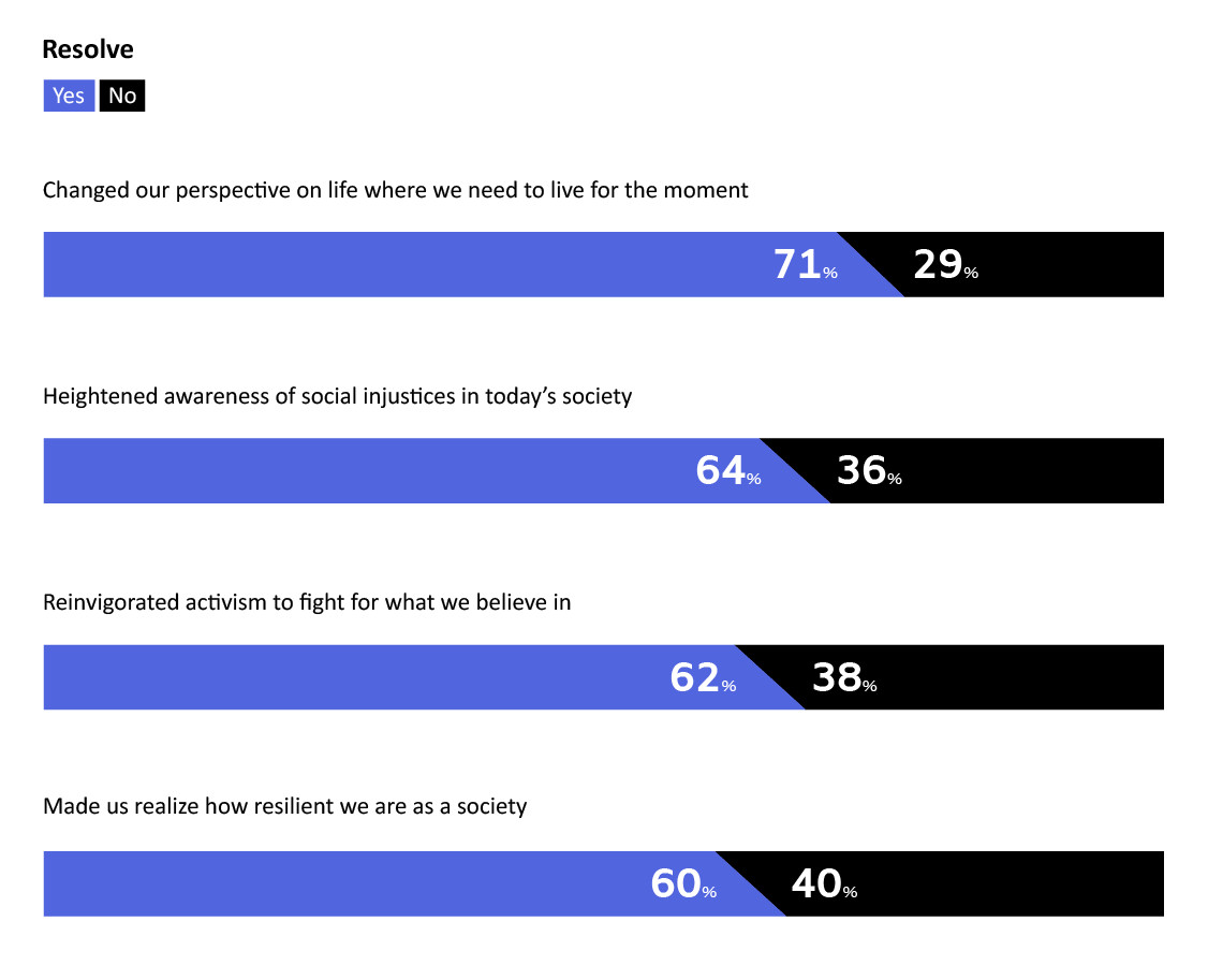 However, a more powerful resolve remains. People recognize that we’ve regressed, but still maintain hope for the future. The majority (68%) are feeling “optimistic that we can overcome the challenges the pandemic has created” and (66%) remain hopeful that we will re-emerge stronger.