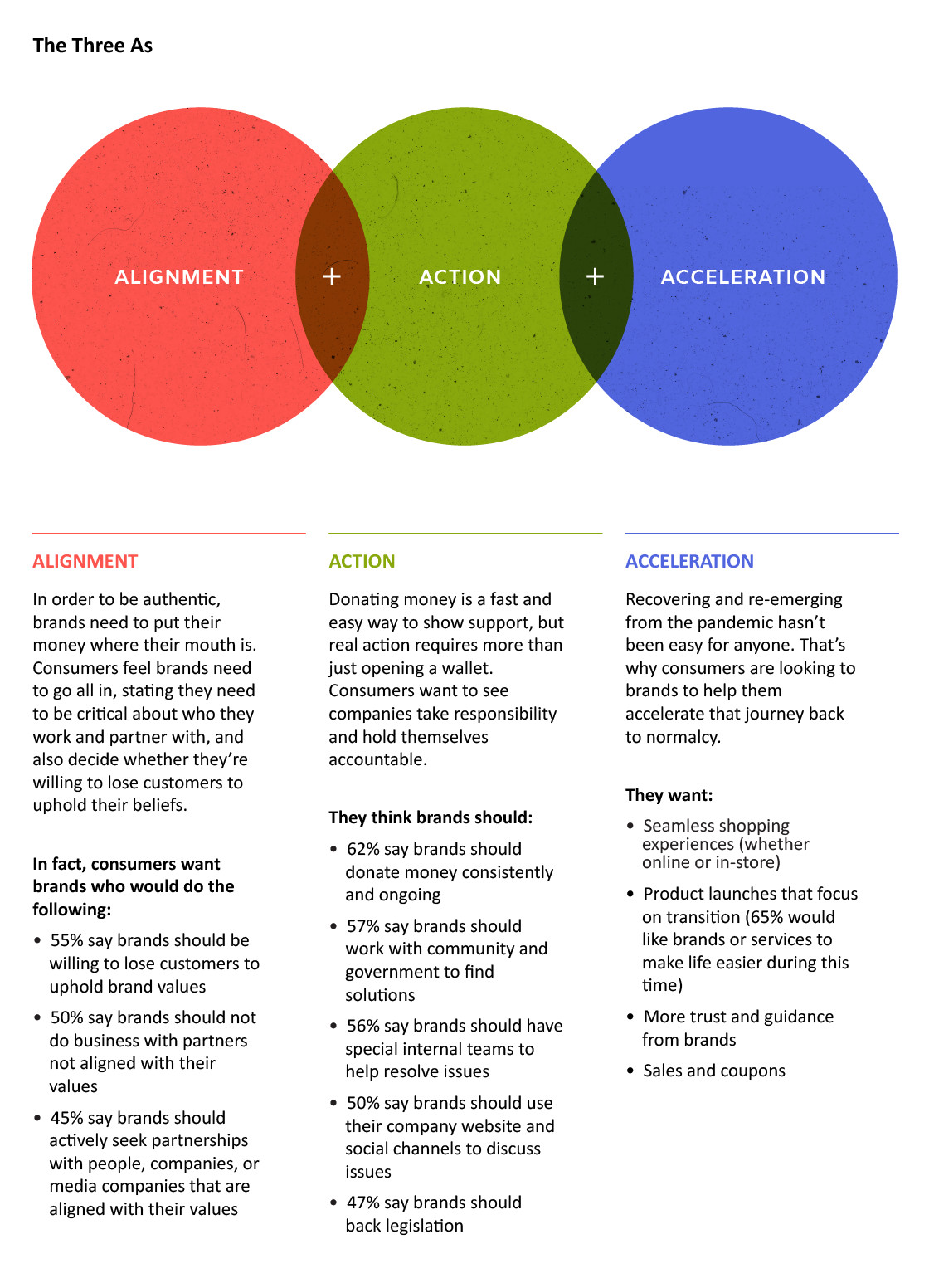 Right now, many companies recognize the positive role they can play within our new normal. In return, consumers now have even greater expectations for brands to engage through alignment, action, and acceleration.