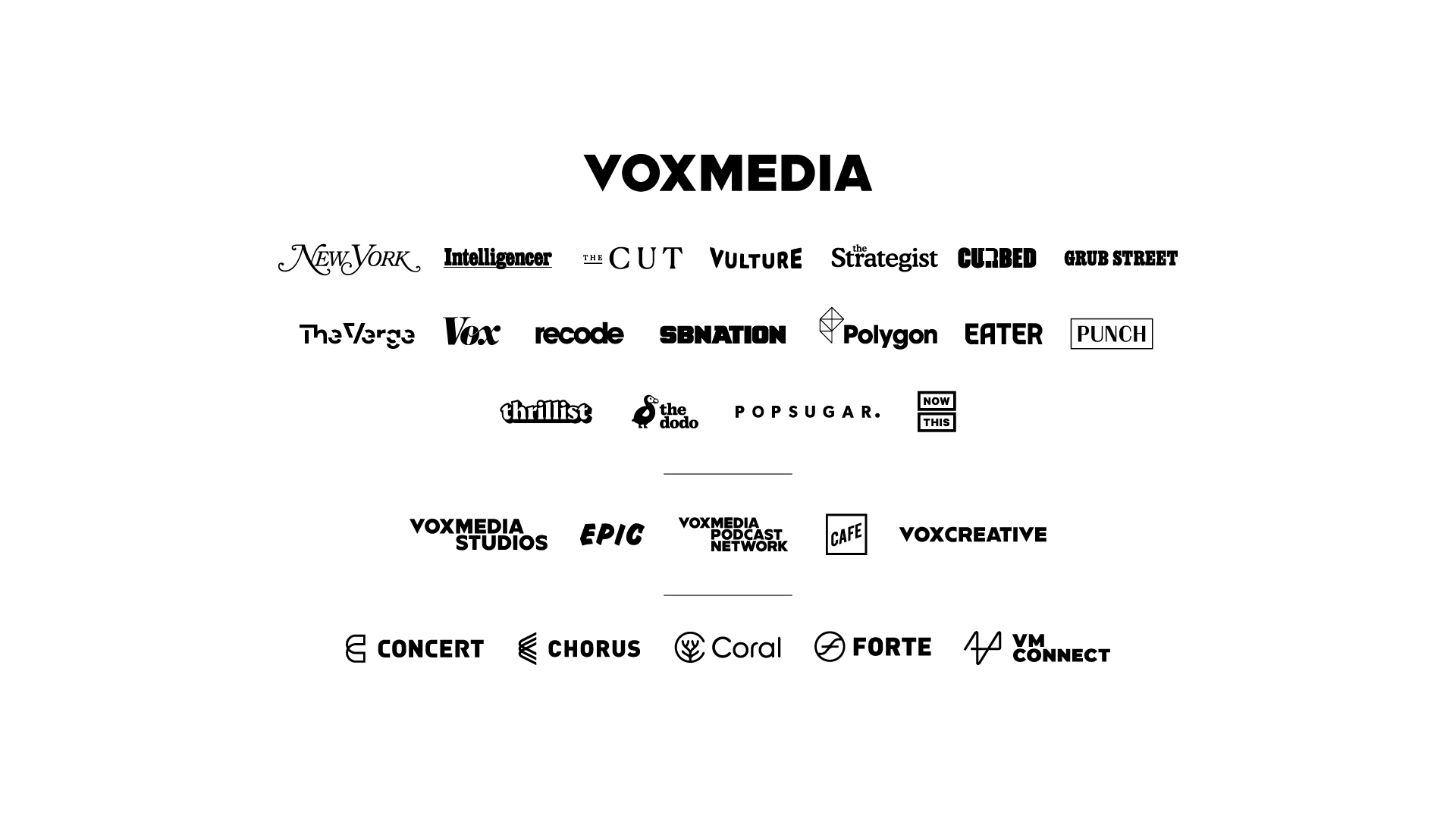 Known for editorial properties including Vox, SB Nation, New York Magazine, The Dodo, and NowThis, the company’s portfolio features the most relevant, respected, and engaging editorial properties and voices. The company is also home to award-winning storytelling businesses such as Vox Media Studios and the Vox Media Podcast Network, as well as innovative technologies that support the entire media industry, including the Concert advertising marketplace.
