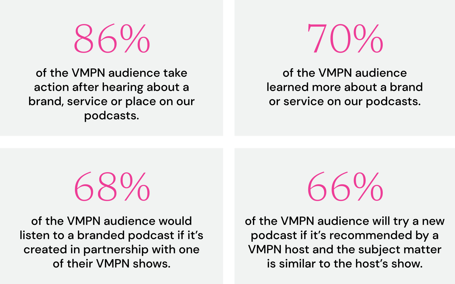 ACTION: 86% of the VMPN audience has taken action after hearing about a brand or service on one of our podcasts, including making a purchase from the brand, using a promo code, and visiting the brand’s website.