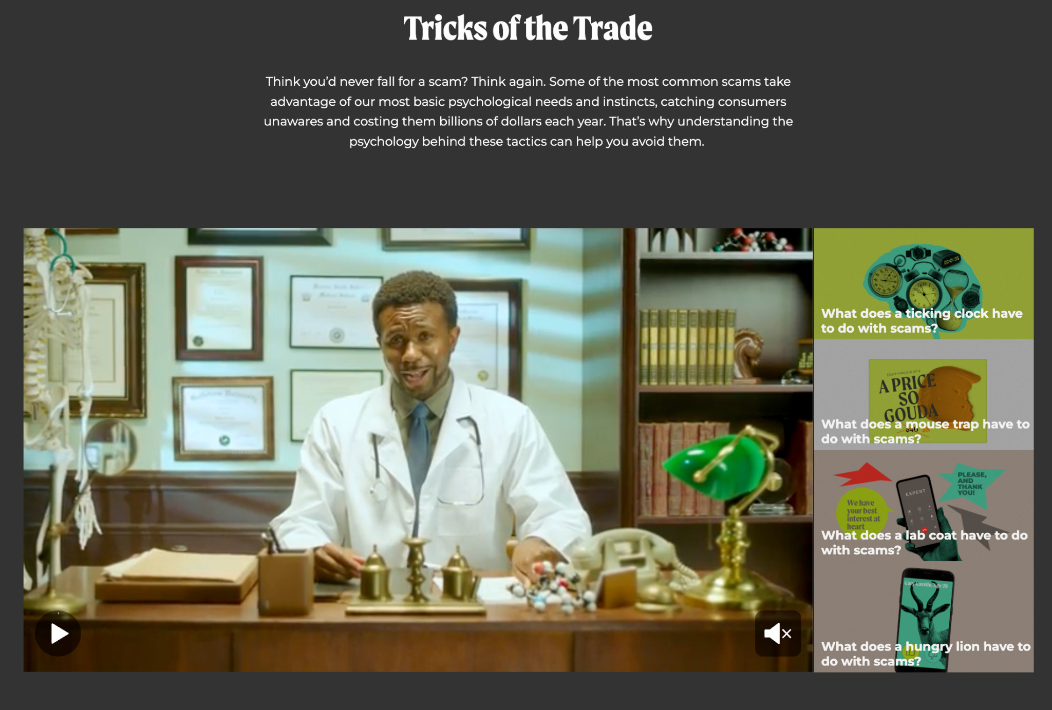 Explainers were created to discuss the psychological tactics used by scammers. The “White Lab Coat” Explainer saw the highest completion rate, suggesting users were most interested in how instruction plays into scams. In the total hub, high impact distribution units were utilized during the campaign, generating 182,600 pageviews, 148,406 unique users, and 110,000 total engaged minutes campaign-to-date.