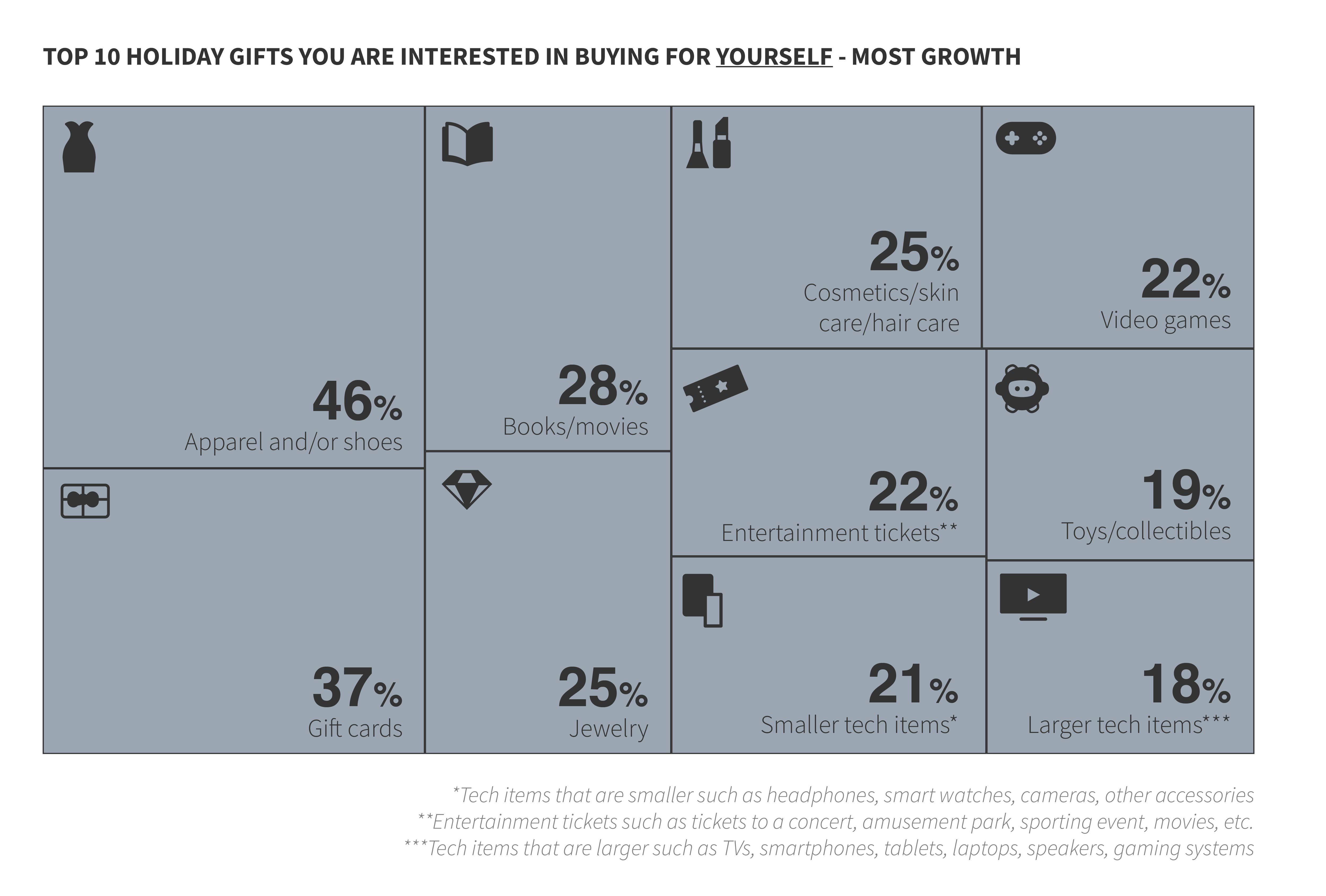 62% of gifting budgets will be dedicated to gifts for family and friends with the remaining 38% meant for self-gifting. Gift cards are the most popular choice for holiday gifting for others this year, as they’re convenient and easy to budget for. Experience-based gifts like concert or sporting event tickets are also seeing growth as consumers look to resume normal life.