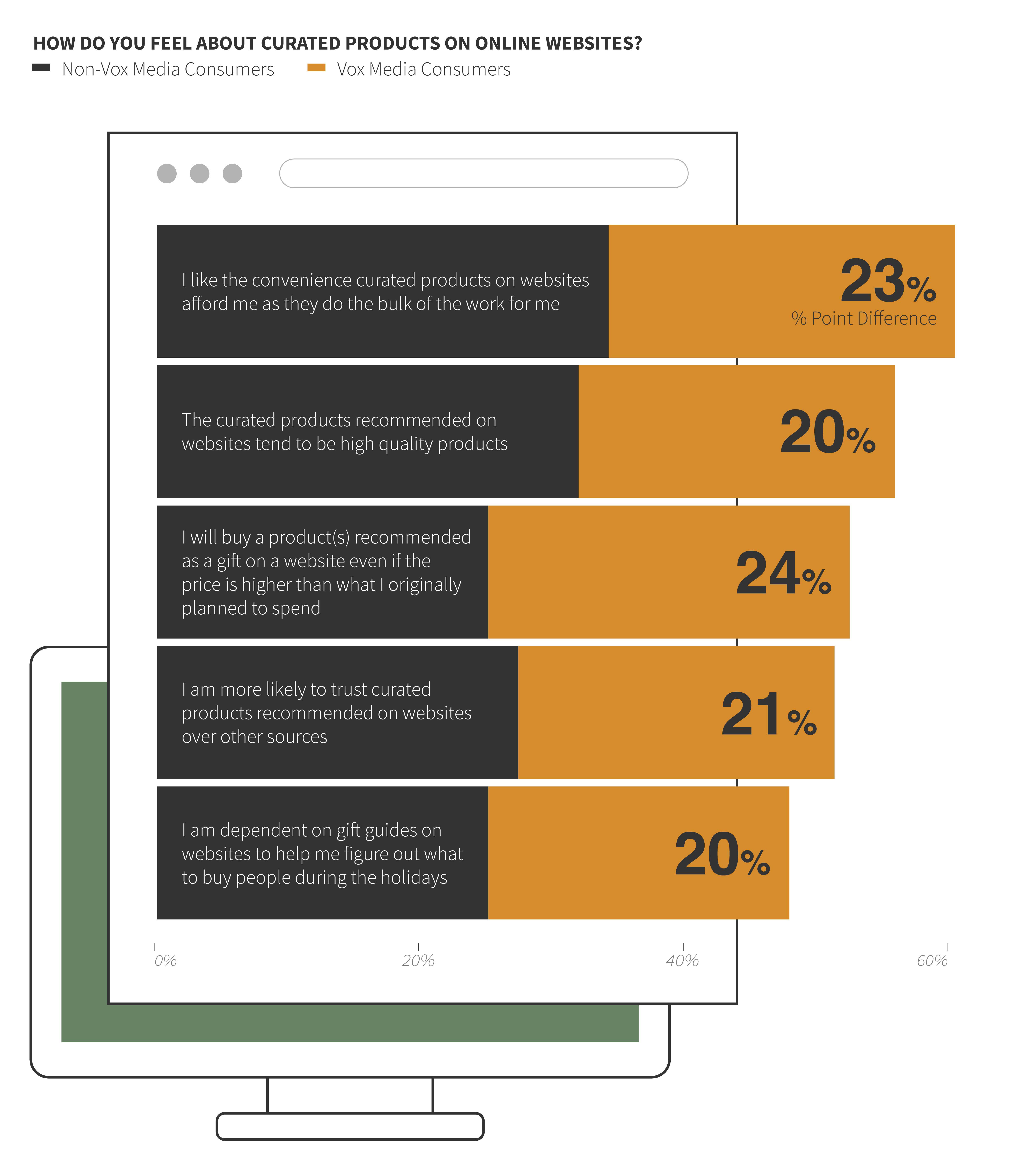 The Vox Media audience is reliant on digital channels and content much more than non-Vox Media consumers to guide their holiday shopping. They are highly influenced by online gift guides, and they trust curated product recommendations, like the ones found across Vox Media sites, to spotlight high-quality products.