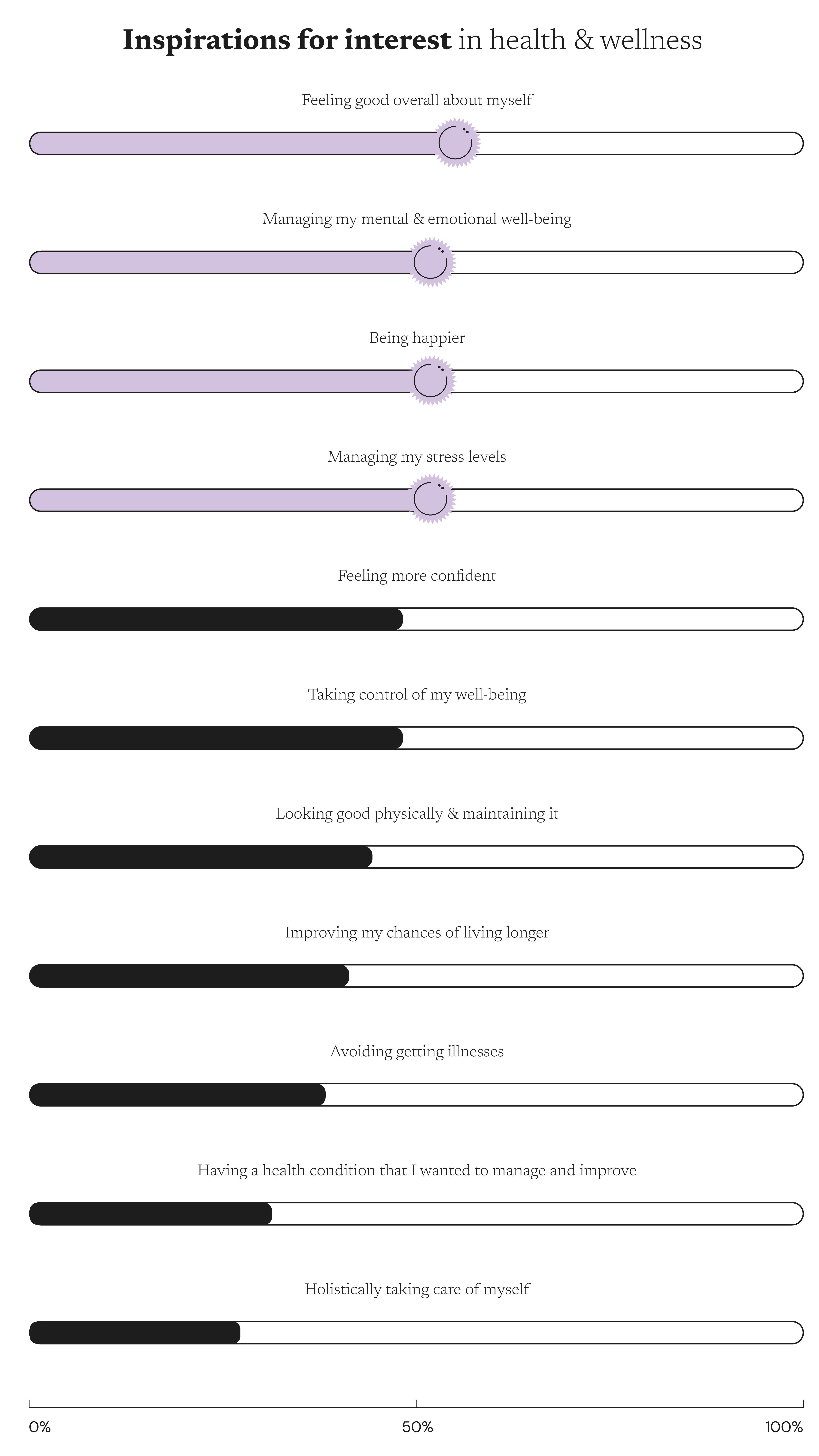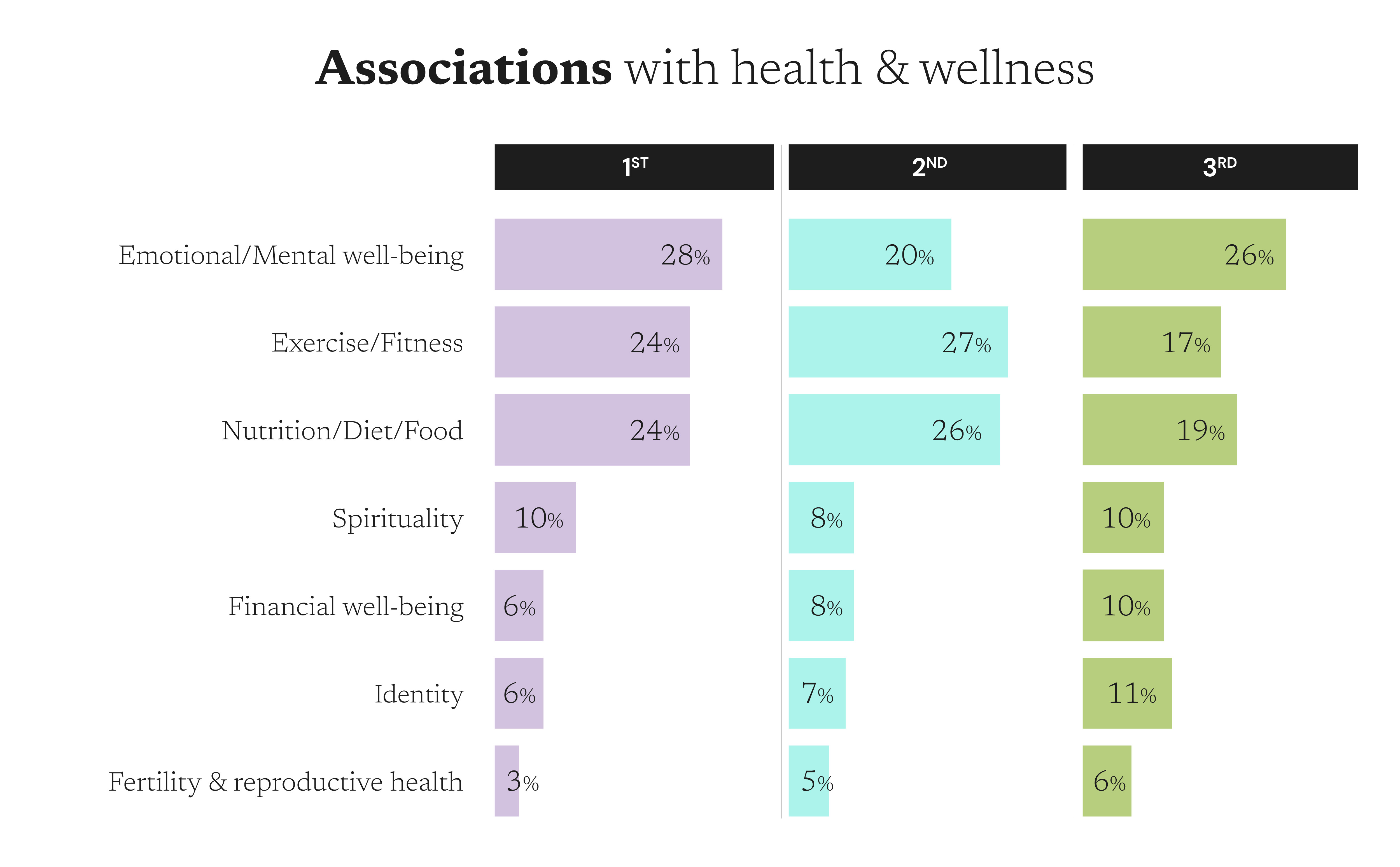 Among those new to the category, as well as consumers who have paid attention to wellness for years, the pandemic played a huge role in emphasizing the importance of mental and emotional self-care. 80% of consumers agree the pandemic helped shed light on wellness topics, including mental health, that people were afraid to bring up before. The category has expanded beyond physical appearances and reactive health such that emotional and mental well-being are most likely to be associated with health and wellness.