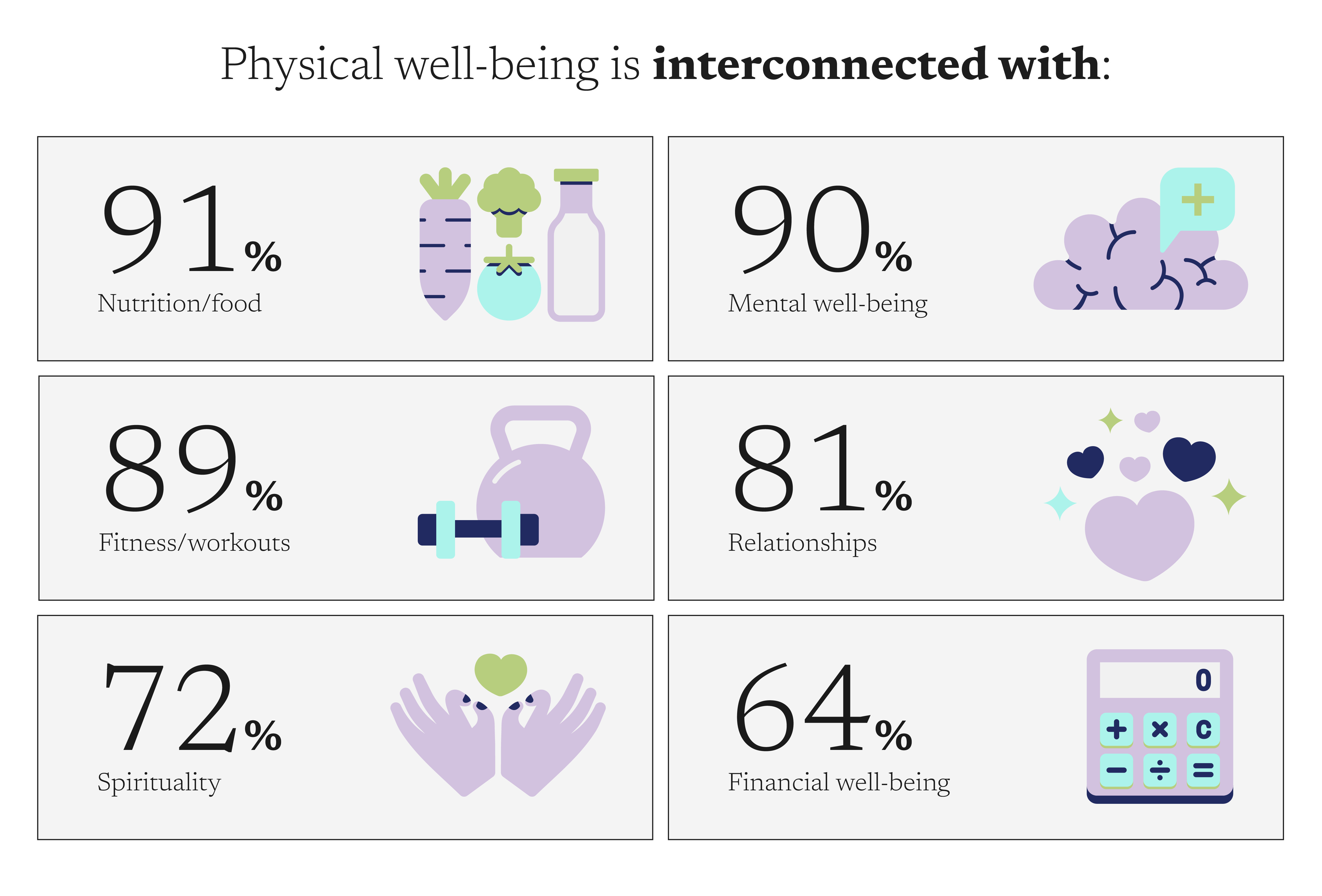 Not surprisingly, nine in ten consumers perceive physical well-being as being interconnected with nutrition & food and fitness & workouts. But just as many people believe that physical well-being is directly related to emotional & mental well-being. Physical well-being is also rooted in having strong relationships, both with loved ones and with something bigger than yourself and with financial security.