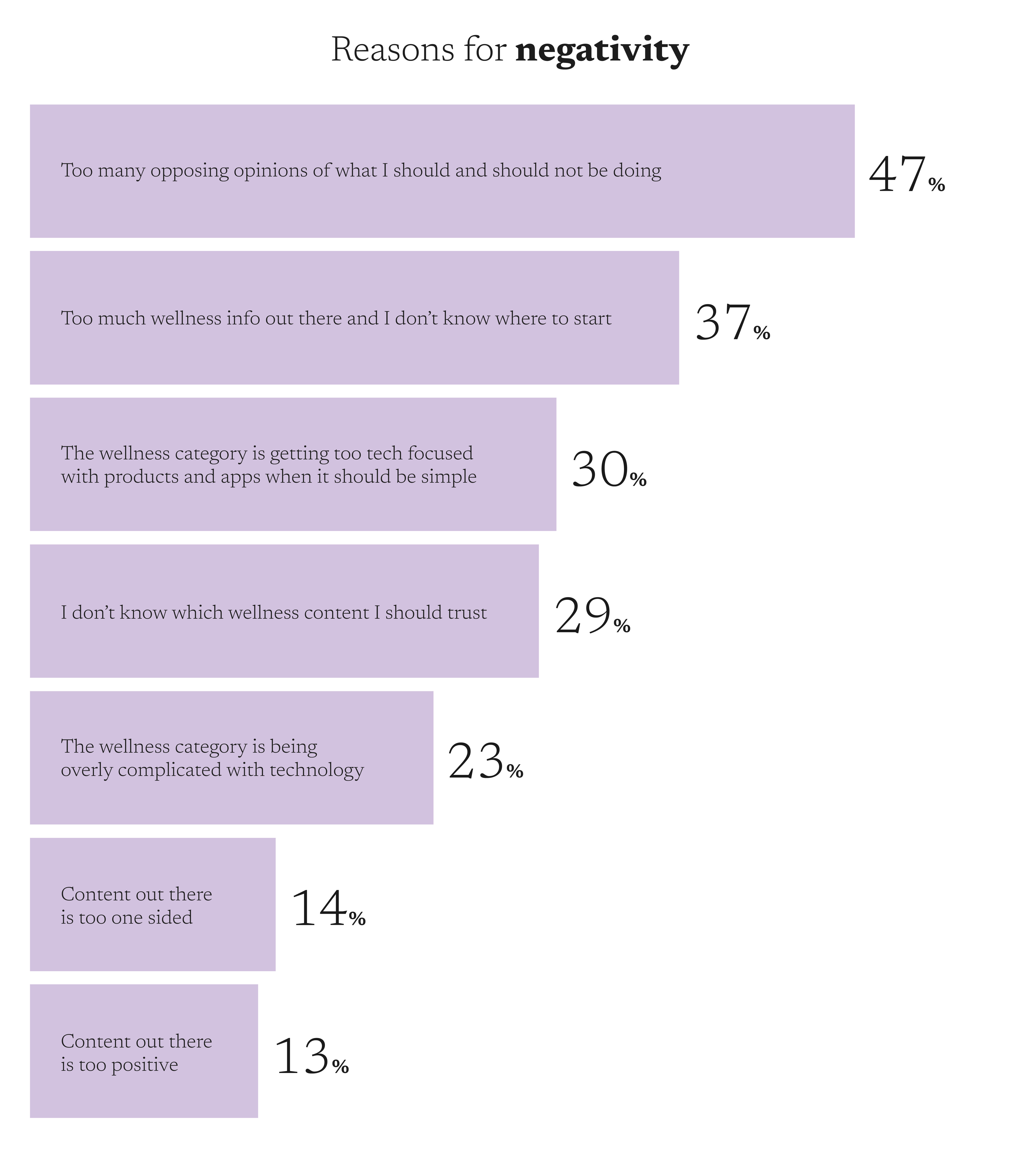 As the wellness space becomes more crowded, negative perceptions are starting to creep in. One in four feel some negative sentiment when thinking about wellness, mostly from a lack of trust in content and general information overload. Technology is also a cause of concern for some in the category, who view it as more complicated than it should be.