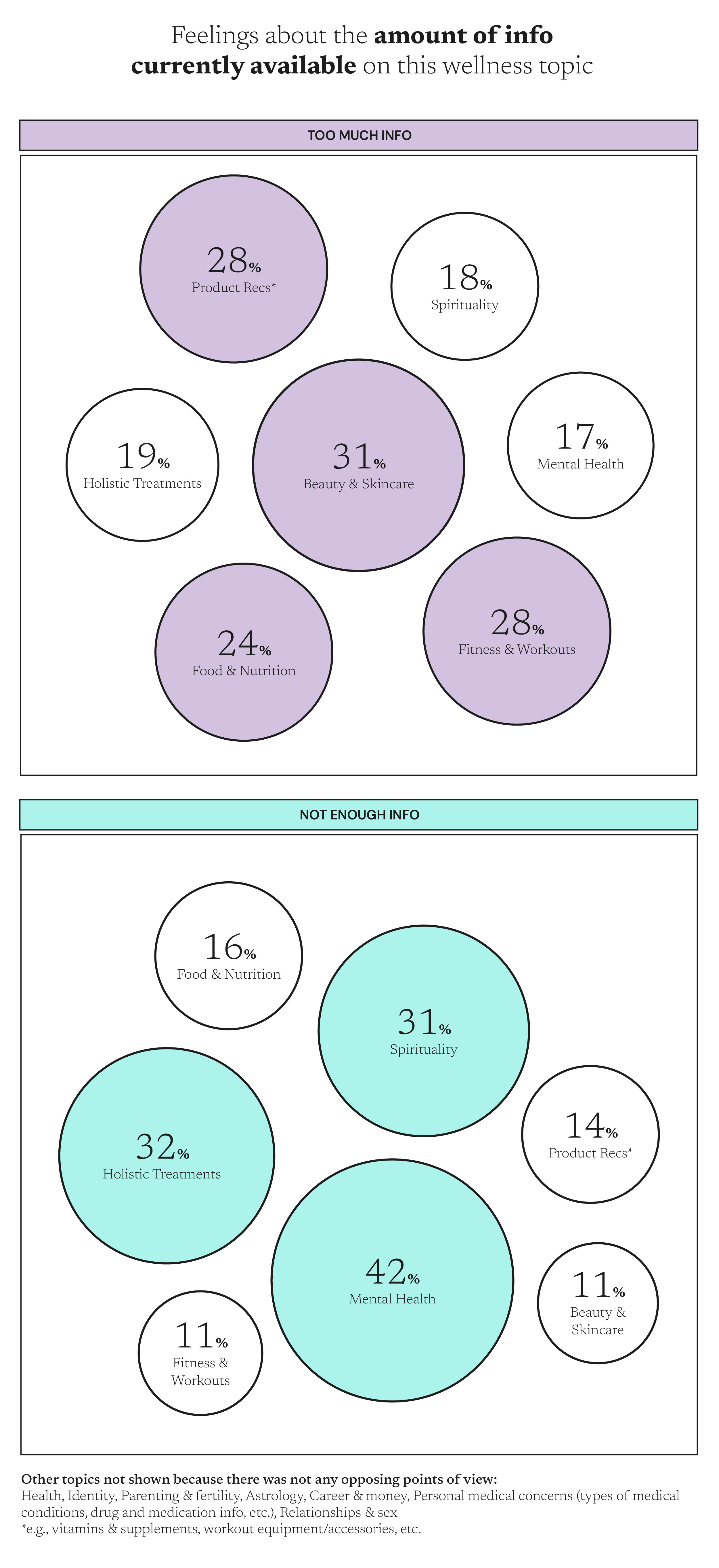 Consumers acknowledge that certain topics are overdone, leaving them with opposing points of view, conflicting advice, and an unrealistic laundry list of product recommendations. That being said, there are certain topics that would benefit from additional coverage; over two in five consumers believe there isn’t currently enough information available about mental health, while one in four want more information about relationships & sex and how to address specific medical concerns.
