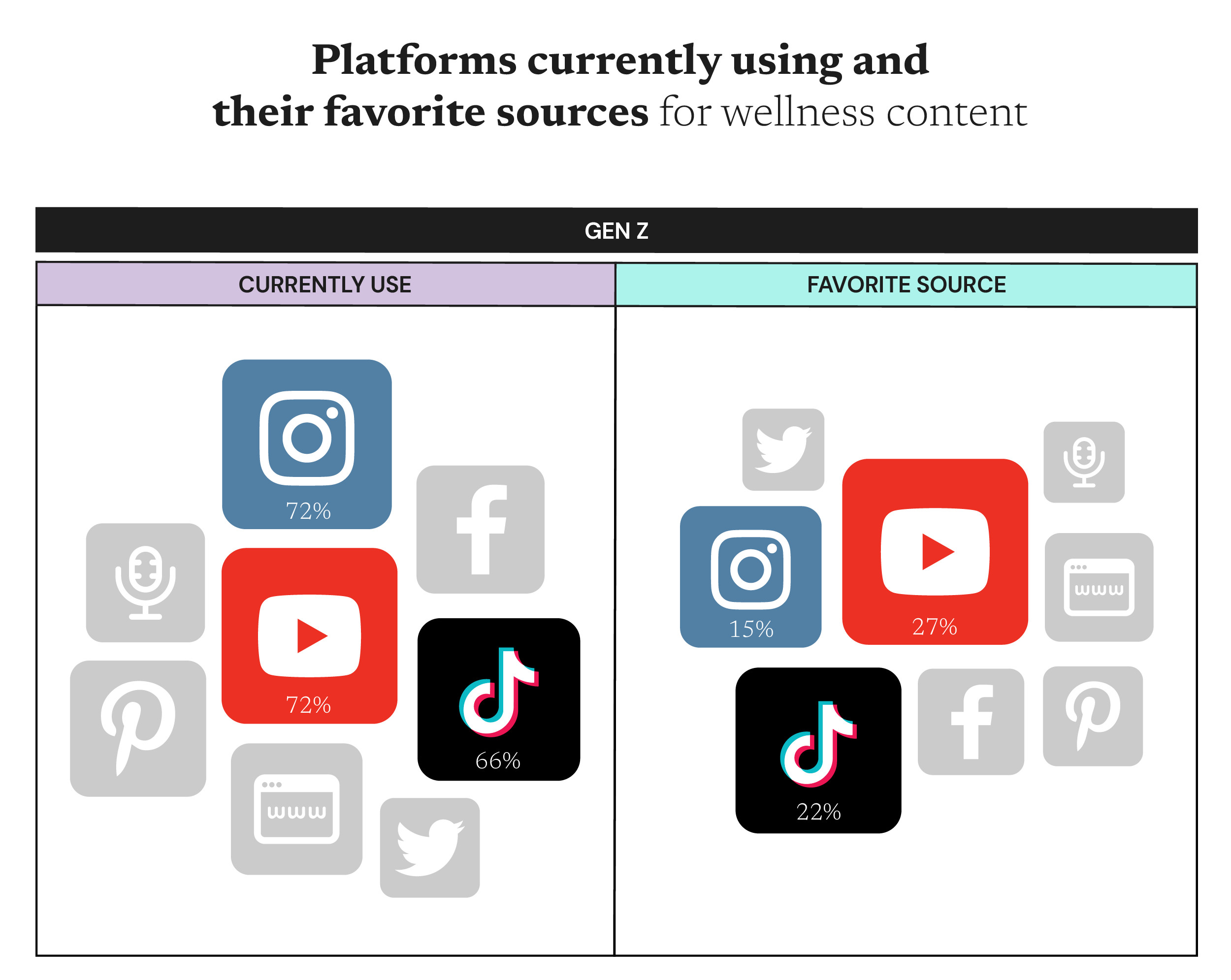Given how expansive the wellness category has become and, similarly, how much digital wellness content is available, consumers are doing what they can to make sense of it all. That starts with identifying which digital and social platforms are worth their time. YouTube ranks as the #1 favorite source for wellness content across generations. Looking at the broader media landscape, Gen Z prefers more visual platforms like Instagram and Tiktok, while older generations are more reliant on Facebook and websites. ‘