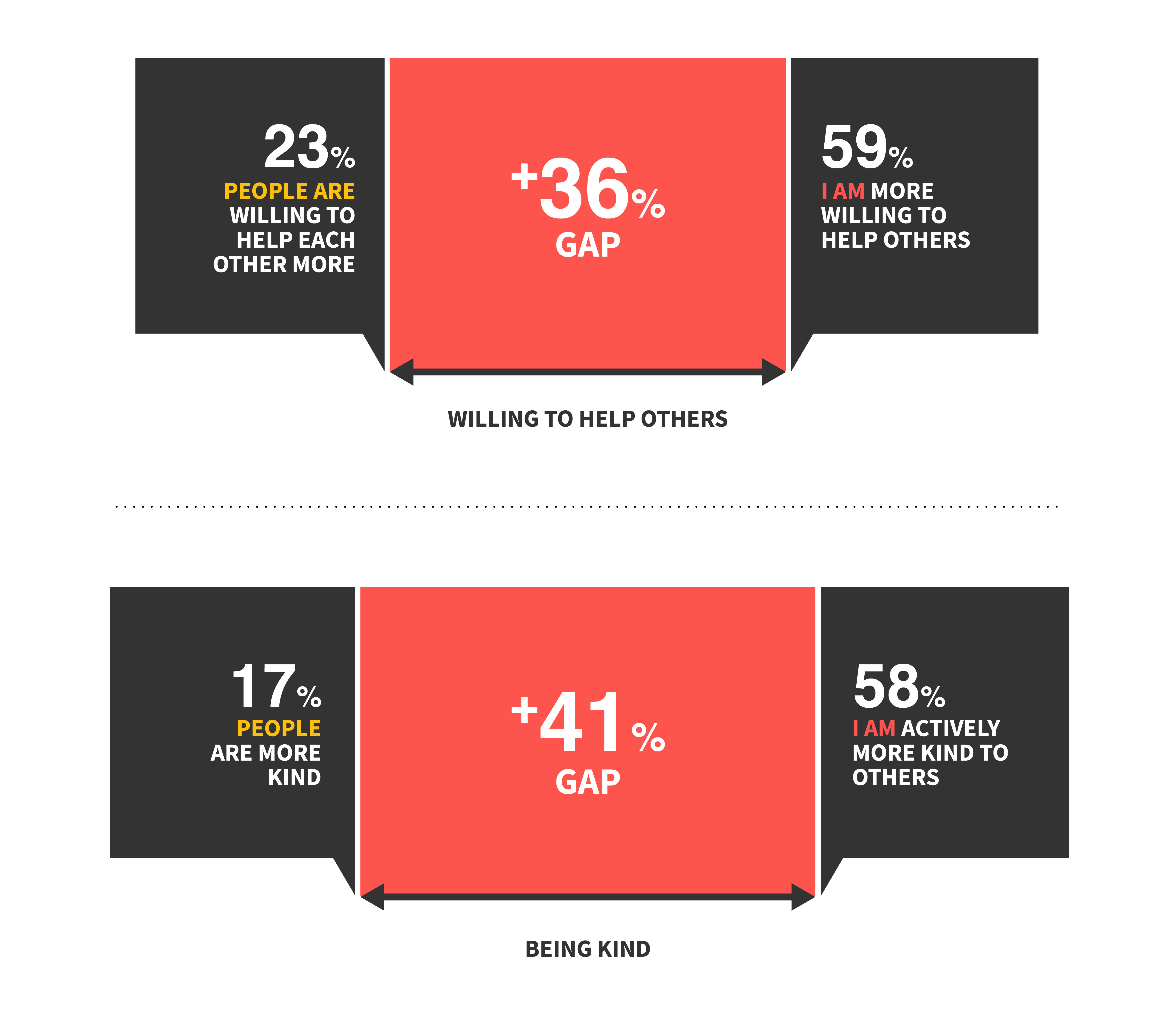 There is a desire for change as 68% are tired of the chaos, and nearly half are considerably more interested in reinventing themselves. ~60% say they are more willing to help others and are actively choosing to be more kind to others. In fact, kindness and helping are where we see the greatest difference of perception of self vs. perception of others.