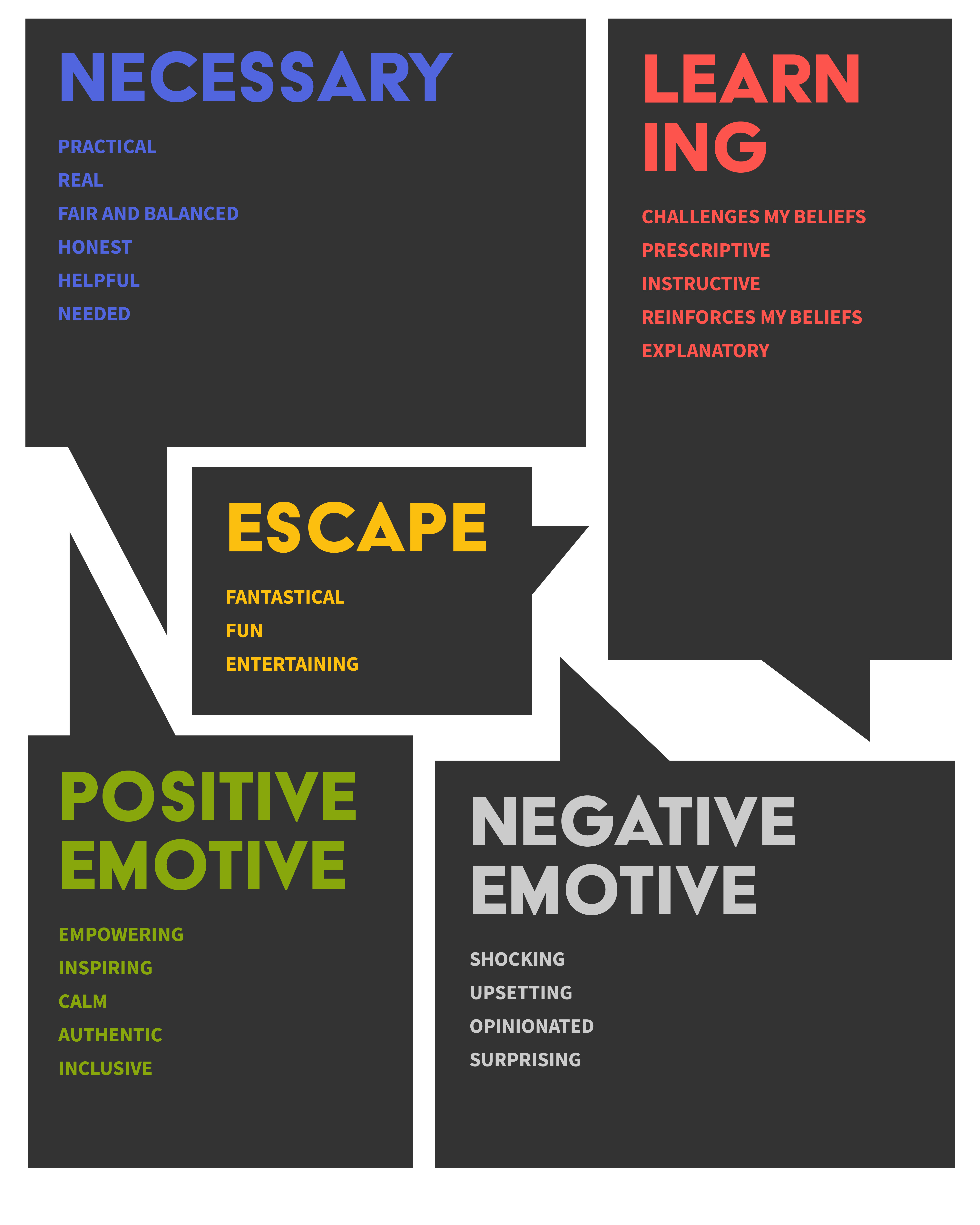 Unsurprisingly, words like “upsetting,” “opinionated,” “real,” and “shocking” came up first. But when we asked consumers what they wished they could see more of, words like “necessary,” “practical,” “fair,” and “helpful” came to mind. What came next was a desire for content that is prescriptive, explanatory, and challenges their beliefs.