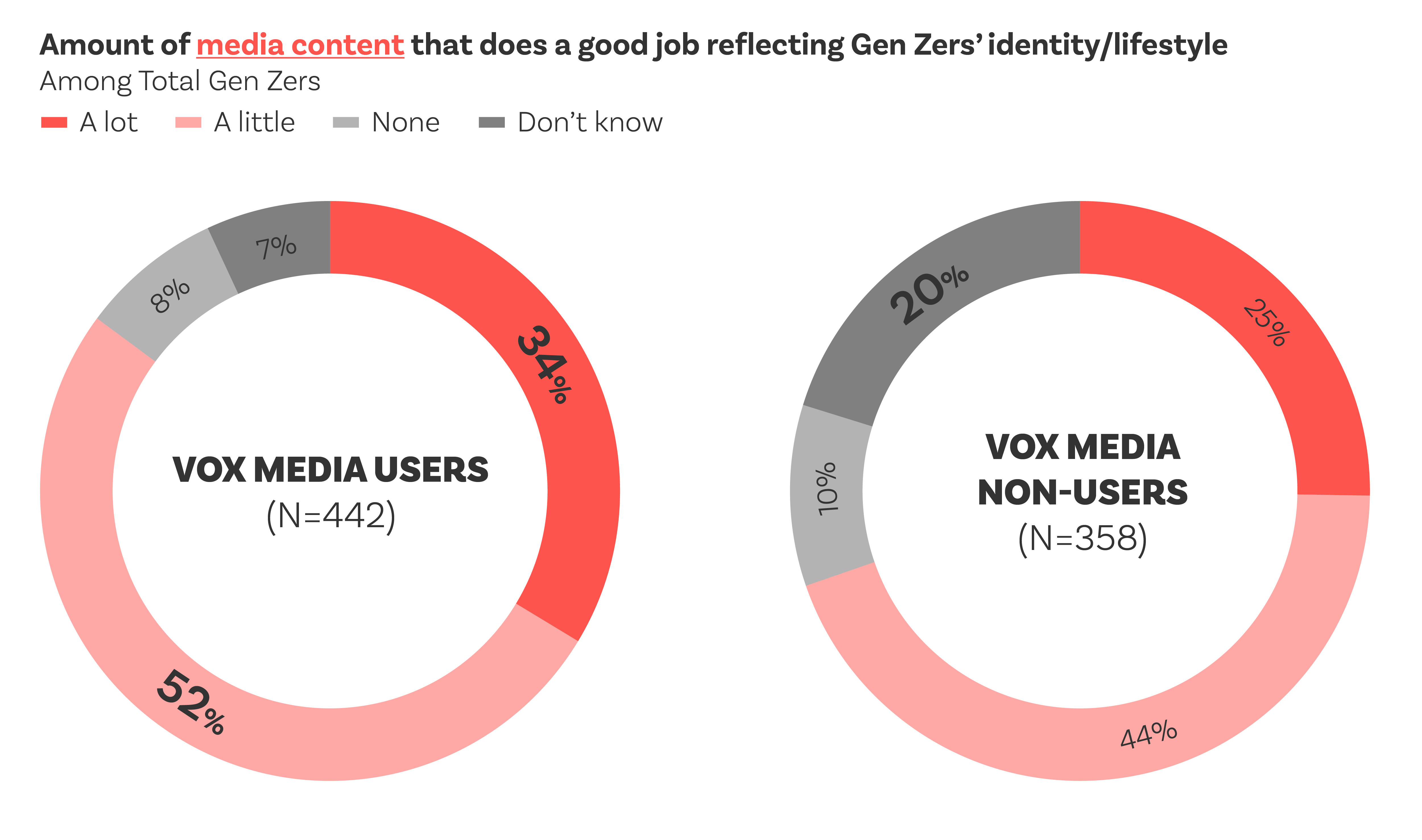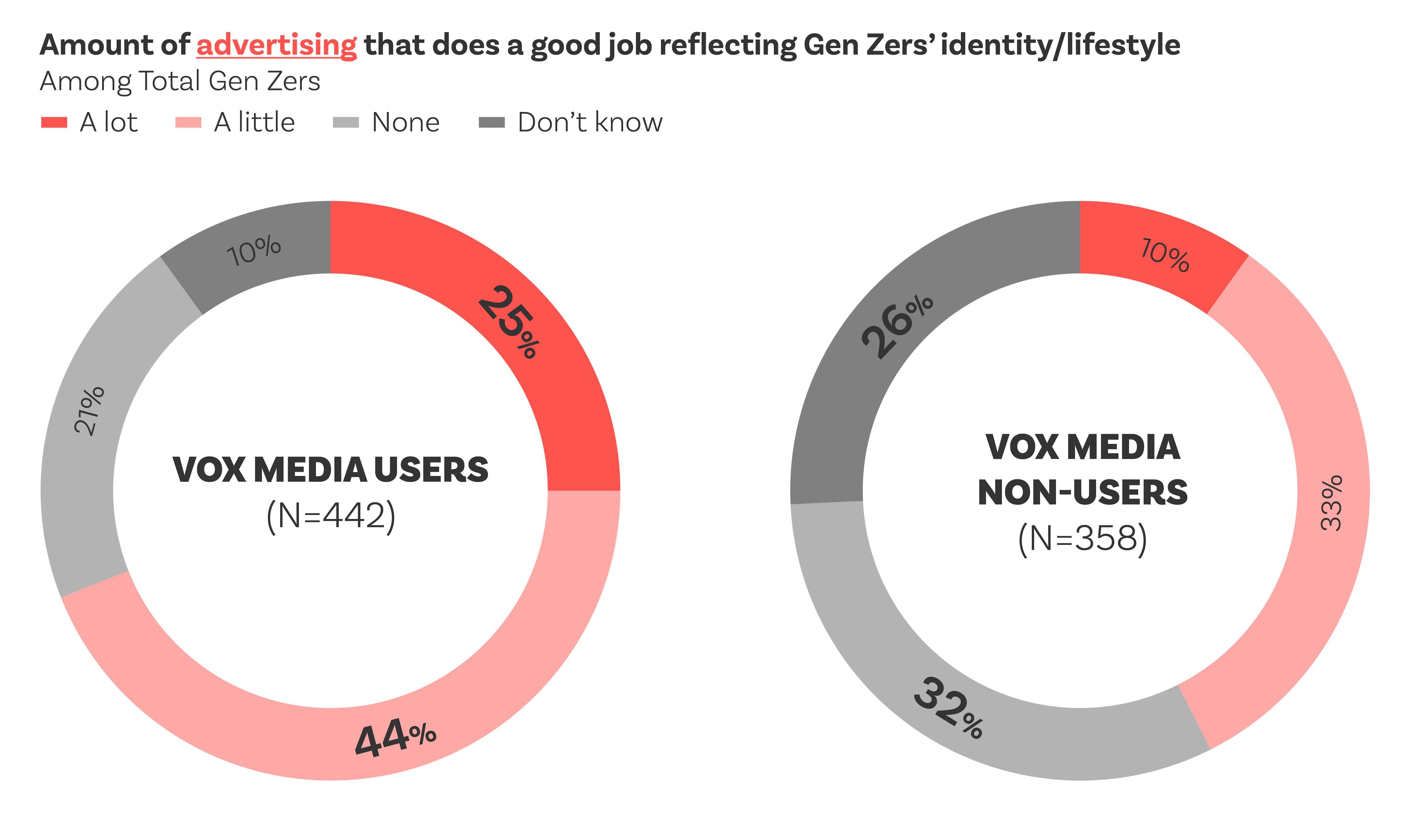 Vox Media’s strength in telling stories that authentically resonate with Gen Z has a halo effect for advertisers. Compared to non-users, the Gen Z Vox Media audience is significantly more likely to also believe that advertising does a good job reflecting their identity and lifestyle. On the other hand, non-users are significantly more likely to say they have yet to see advertising that accurately depicts who they are.