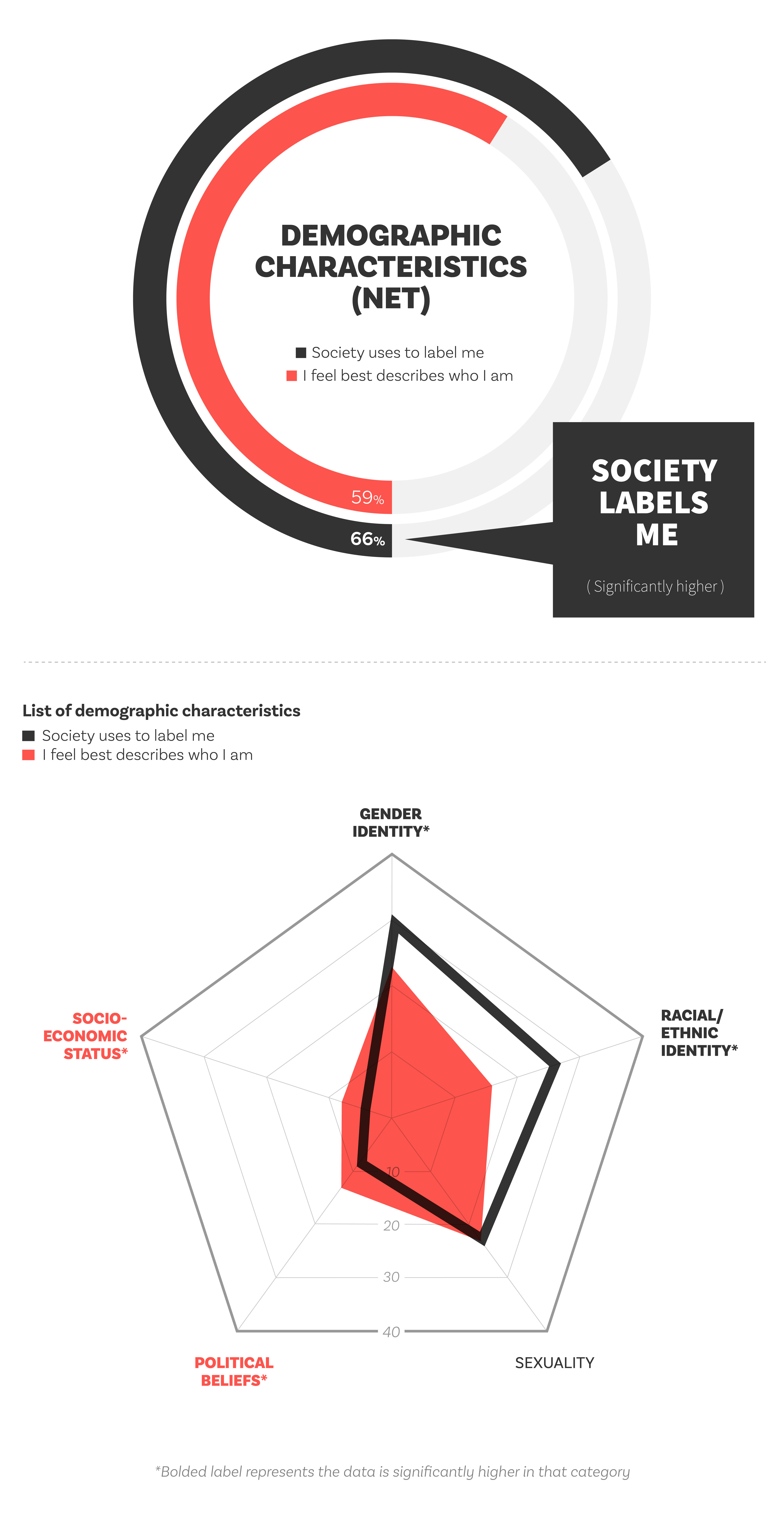 Gen Z self-identifies based on a collection of intersectional attributes and describes society’s labeling as much more siloed. Gen Z believes society assigns labels by characteristics such as gender, race, and physical characteristics, while Gen Z-ers identify themselves first and foremost based on their personality traits, hobbies, interests, and passions. In general, 66% of Gen Z-ers say society assigns labels based on demographic characteristics, while 81% would prefer to be defined by more personal attributes like personality traits or hobbies.