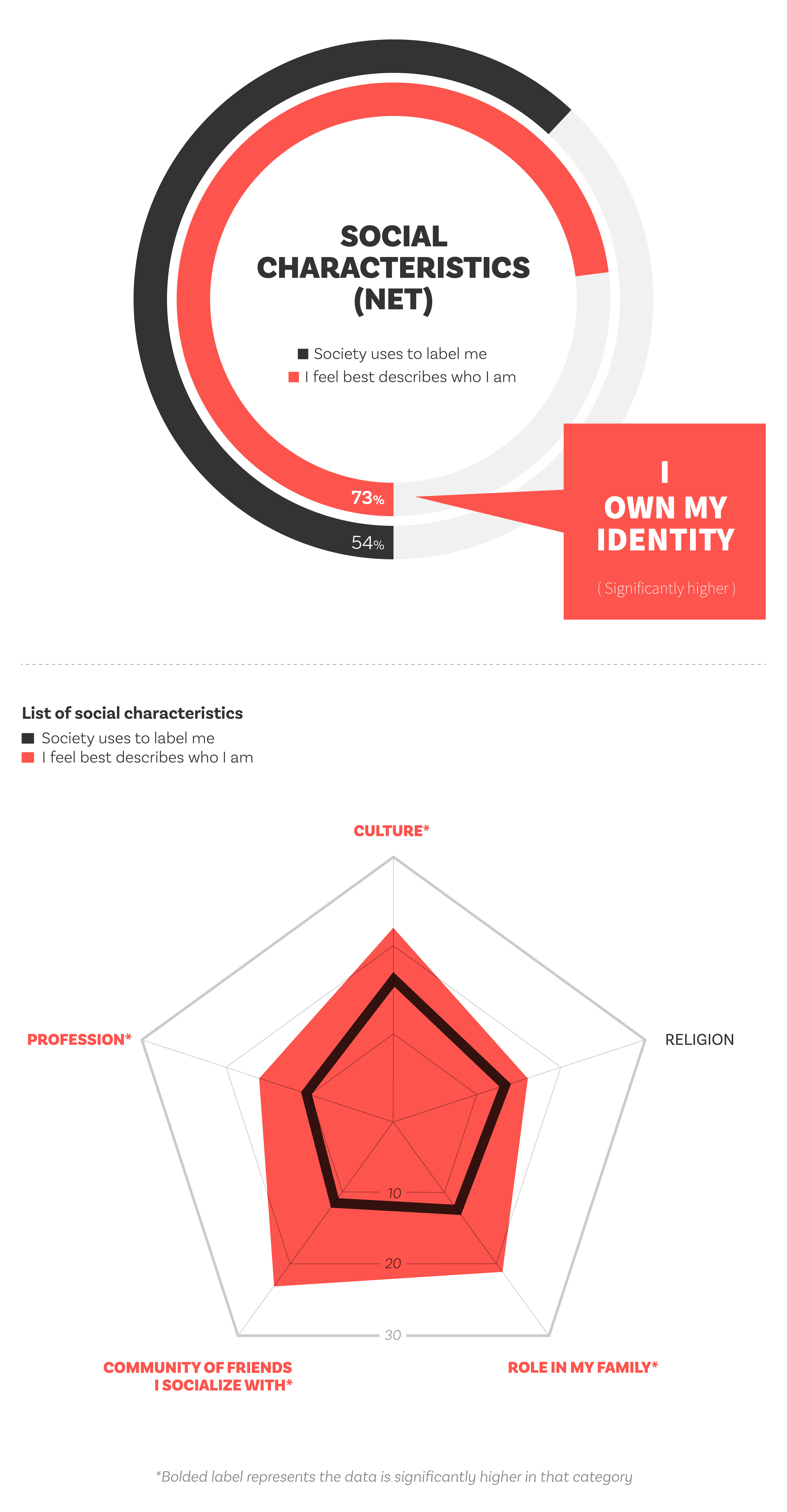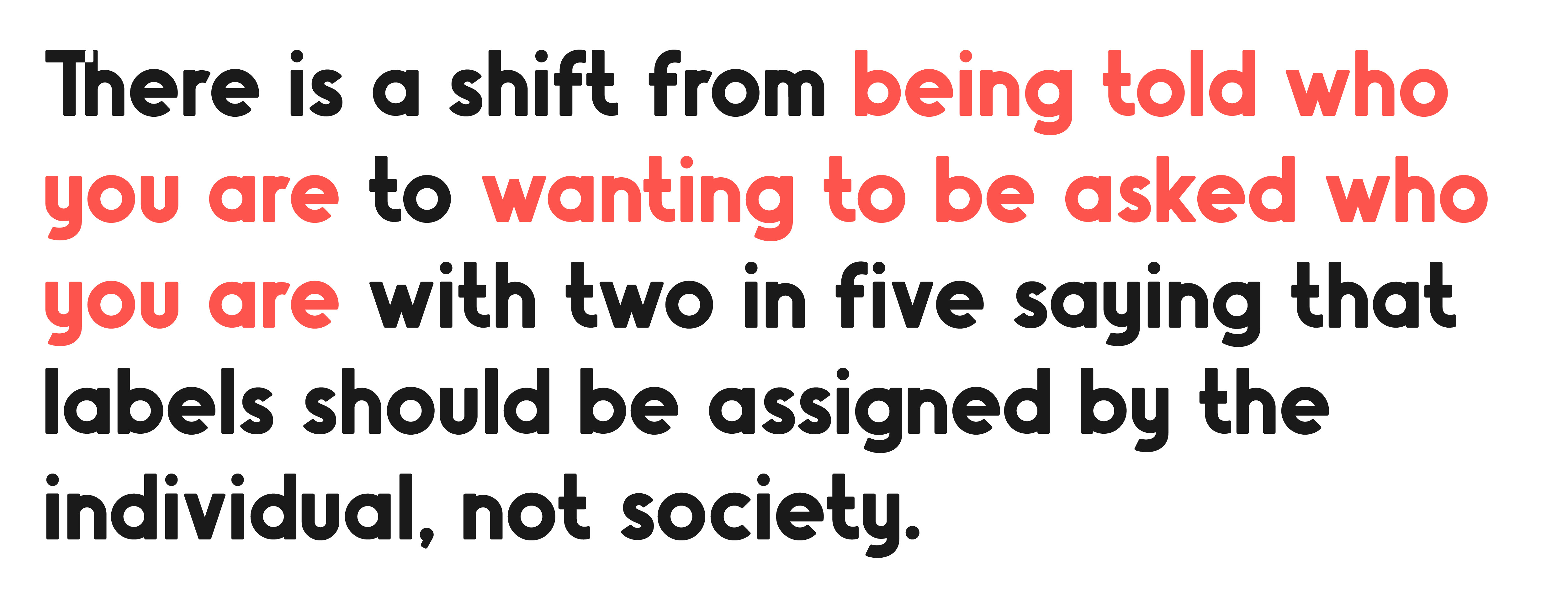 Gen Z-ers’ preference for a more personal construction of identity underscores the normalization of an intersectional and multi-faceted approach to identity. There is a shift from being told who you are to wanting to be asked who you are, with two in five saying that labels should be assigned by the individual, not society.