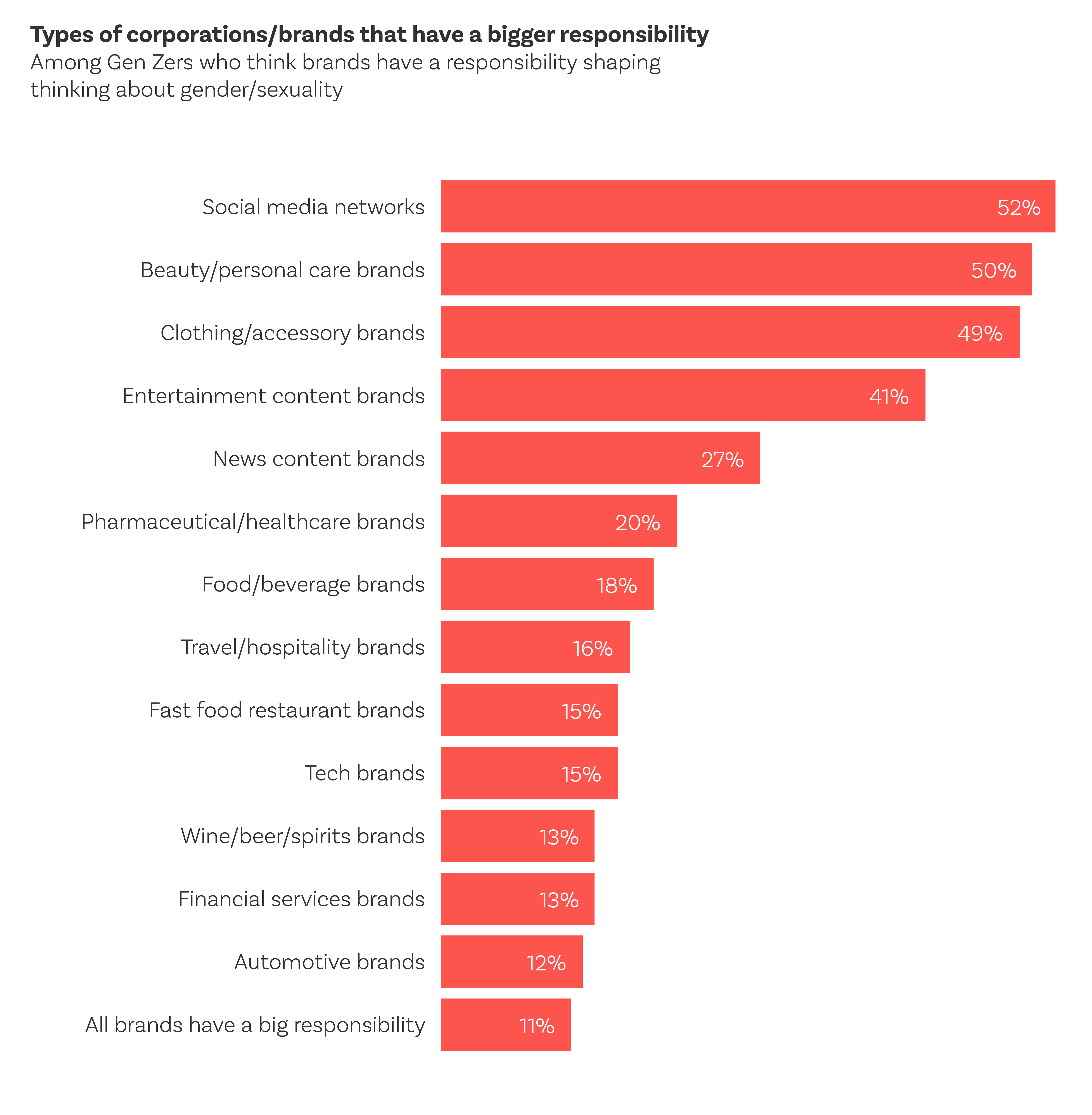 Certain types of brands are perceived as having a greater responsibility in shaping how people think about gender identity or sexuality. Beauty & personal care brands and clothing & accessory brands, in particular, are viewed as having the biggest responsibility — which is not totally surprising, given how connected they both are with outward appearances and how a person is physically perceived. Alcohol brands, financial services brands, and auto brands are thought to have the least responsibility, but there’s an opportunity for brands in these categories to rise to the occasion and build a company, offering, and marketing that will deeply connect with this next generation of consumers.