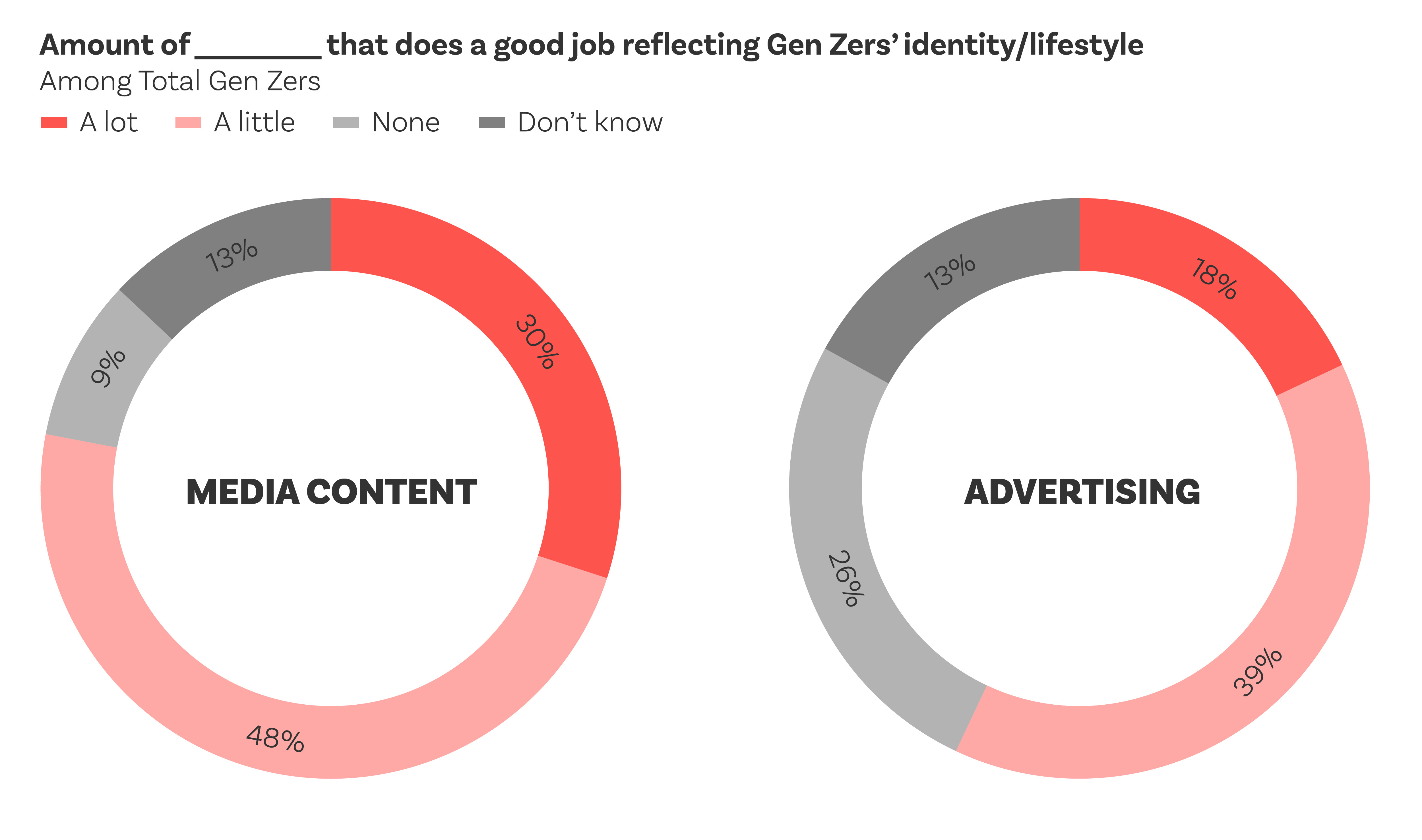 While the majority of Gen Z-ers feel that there is at least some media content that does a good job at reflecting their identity and lifestyle, traditional advertising is less likely to resonate with Gen Z. One in four feel there is no advertising that truly reflects Gen Z’s identity or lifestyle. This represents a huge opportunity for consumer brands to partner with media publishers who have developed meaningful relationships with the younger generation to build brand trust and authority.