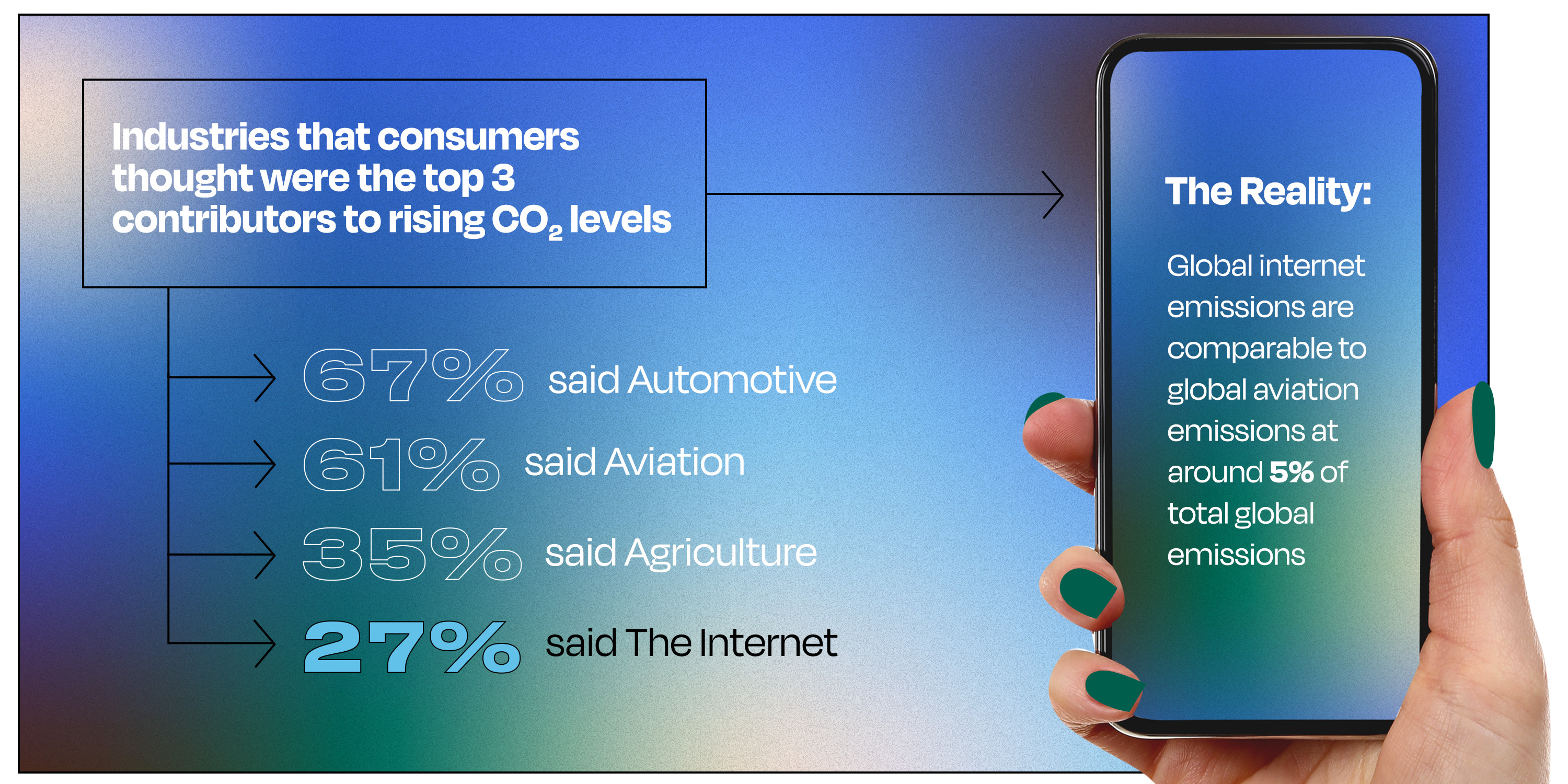 However, when consumers are made aware of the actual scope of the issue, that global internet emissions are comparable to global aviation emissions (roughly 5% of total global emission), 80% had never seen these figures and 75% of our respondents found this very surprising.