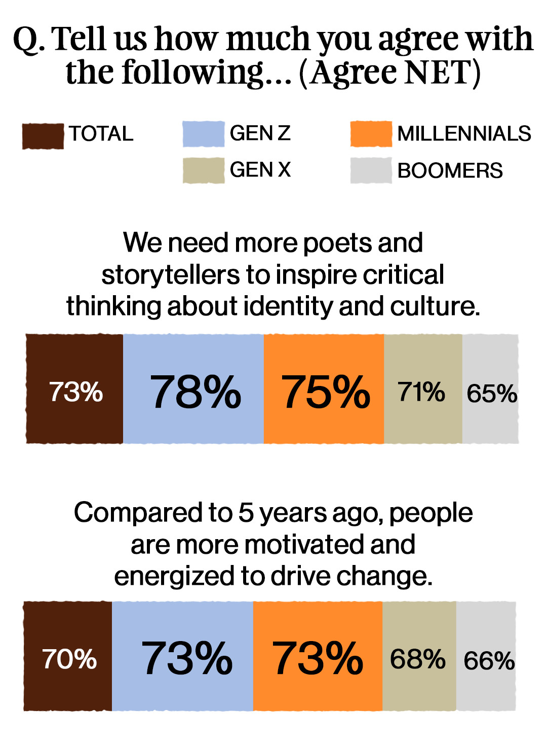 The hunger for meaningful narratives remains palpable. Nearly three-quarters of us, led by the voices of Gen Z (78%), believe we need more storytellers to challenge our thinking about identity and culture.