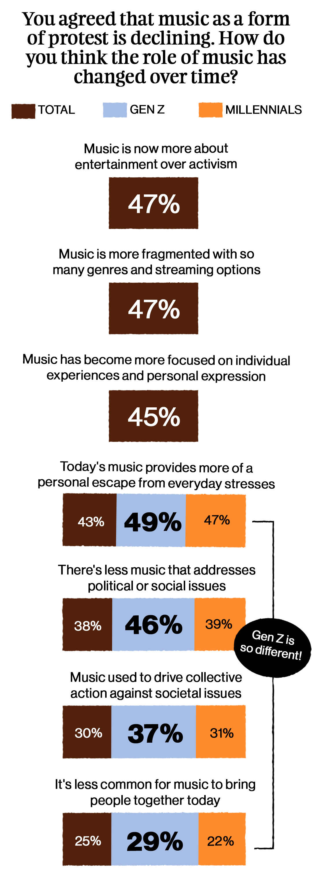 As cultural expression shifts, 62% note that music as a tool for protest is fading – even more true for younger cohorts.