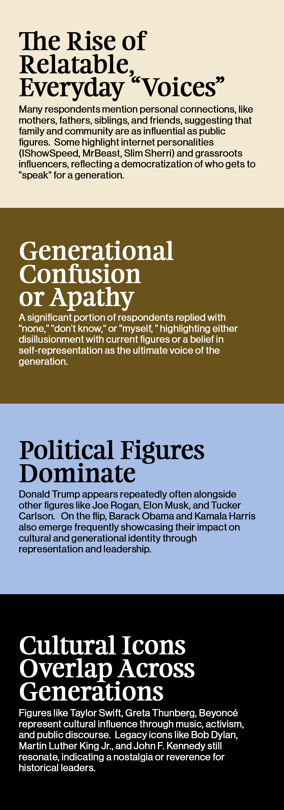 When we ask consumers if they can name JUST ONE person they’d consider the voice of this generation, 50% could not name even one person. For those who could:
