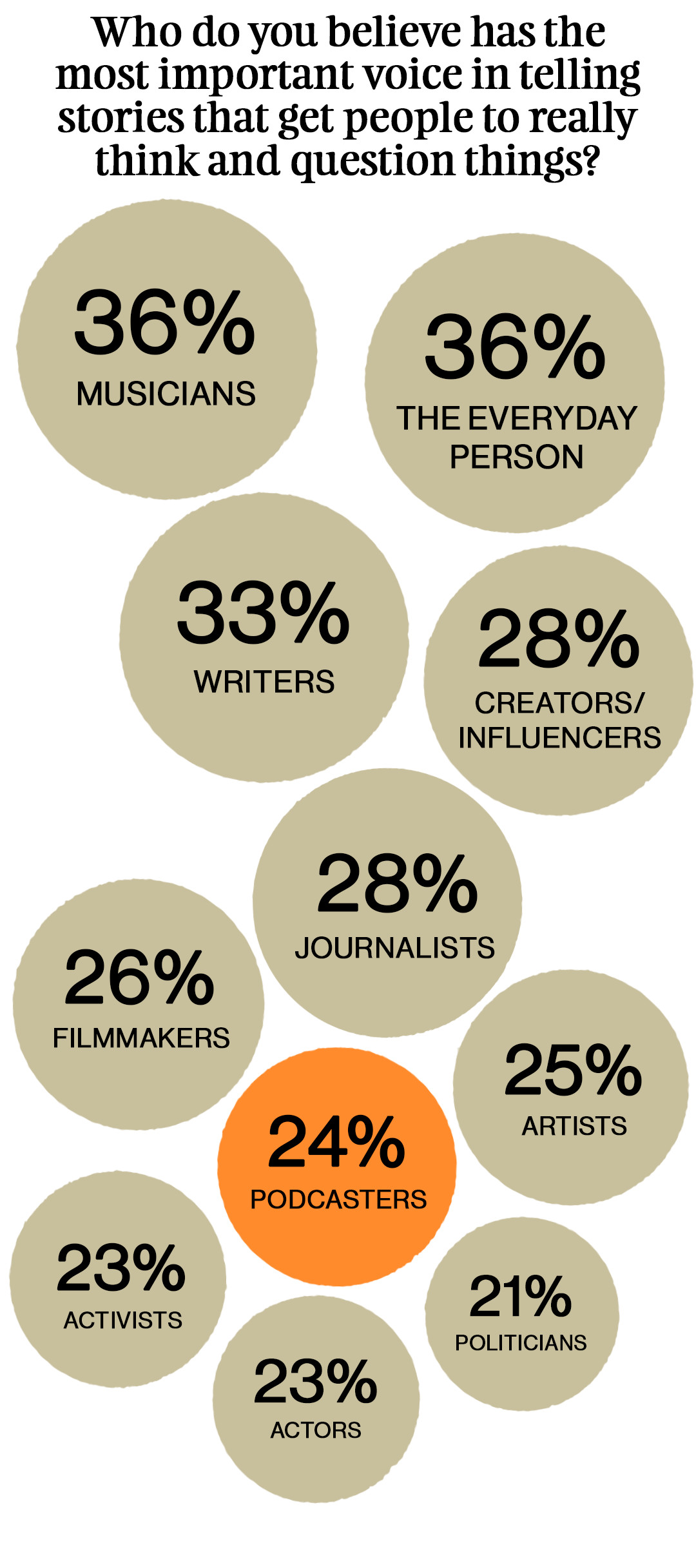 1 in 4 believes podcasters are the voice of our generation, with 44% seeing podcasts as the most powerful medium for sharing stories that provoke thought and inspire critical questioning.