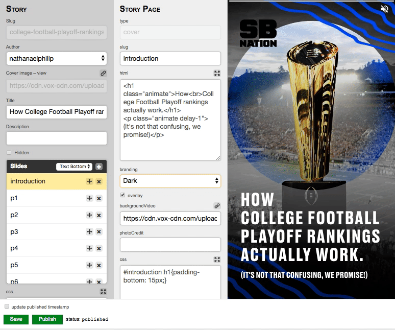 The Story Builder allows us to have all of the options we need for branding and AMP validation and customize our story pages. As technical requirements changed and our editorial sensibilities on the rhythm and flow of the content we created, we made updates to the tool that in turn flowed into the AMP Stories we had created.